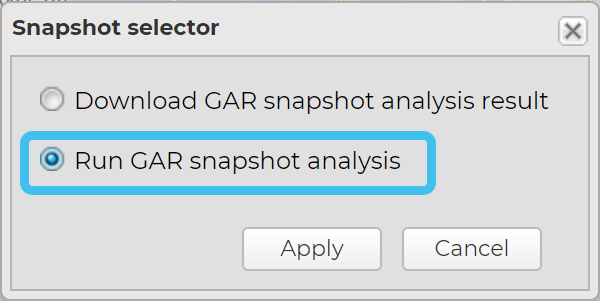 On the ESPA analysis center, right-click the map then select Snapshot analysis from the menu. Use the Snapshot GAR analysis dialog box to specify your analysis criteria, then click Save. Your results are now available on the Case analyses tab of the Case management view.