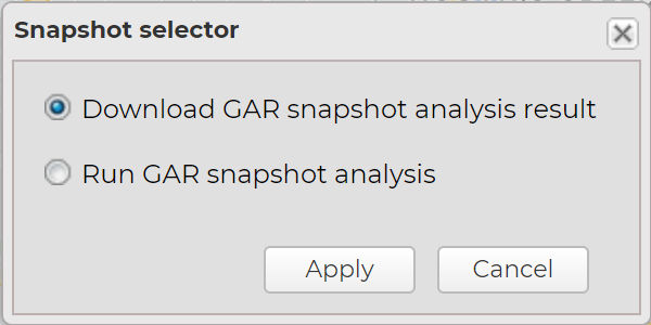 This section describes how to use the snapshot analysis to identify which cell towers provide coverage in a specific location. You can either download GAR snapshots which were previously created using the GAR user interface software, or use approved GAR data to generate a snapshot analysis in OSS-ESPA. The results of both outputs are the same with the exception that the analysis done in OSS-ESPA does not currently include the neighboring cells. You can select which method you require using the Snapshot selector dialog box.