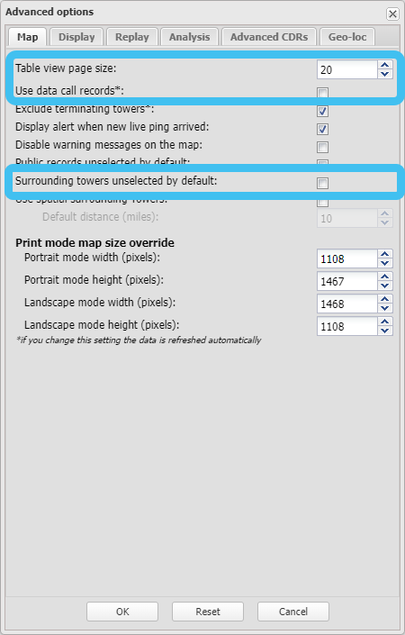the Map tab's Table view page size, Use data call records, and Surrounding towers unselected by default.