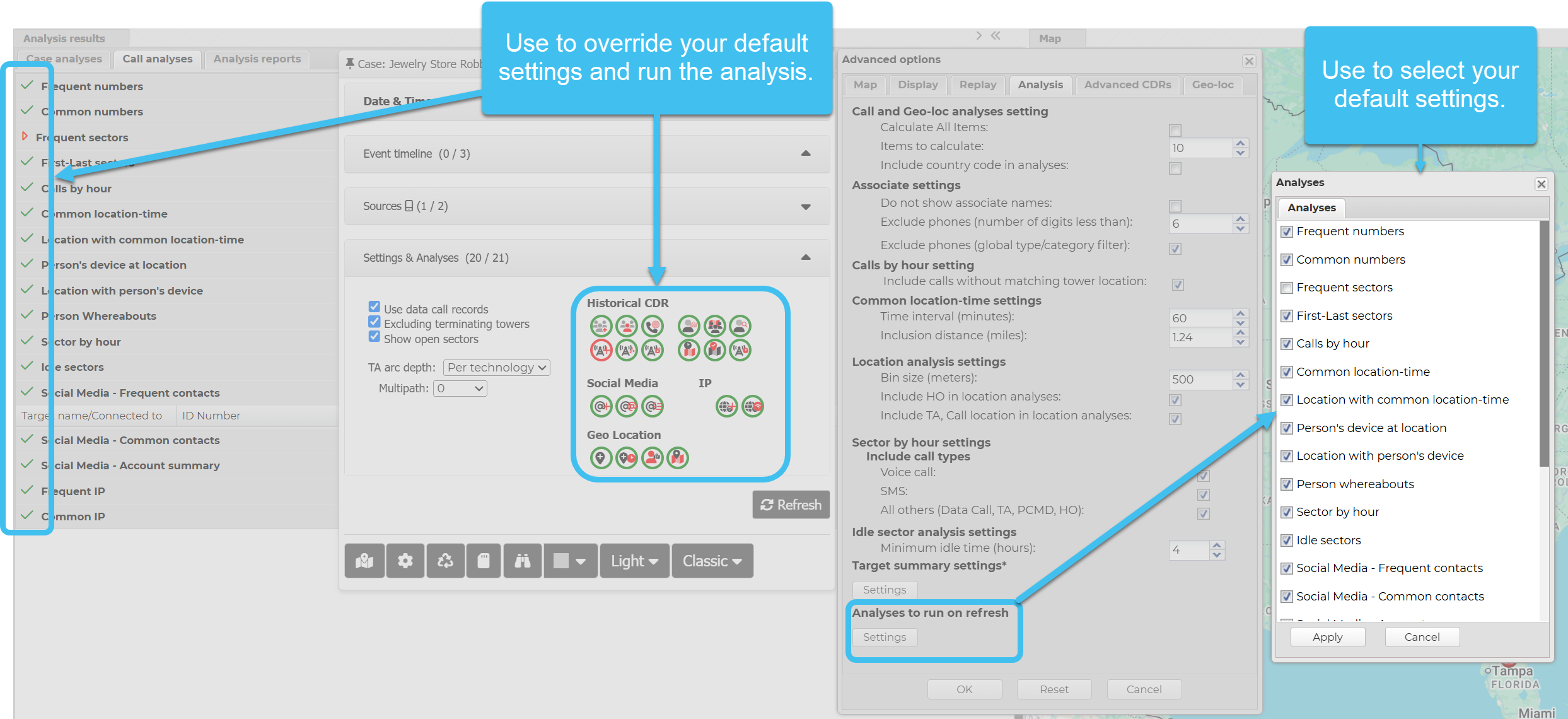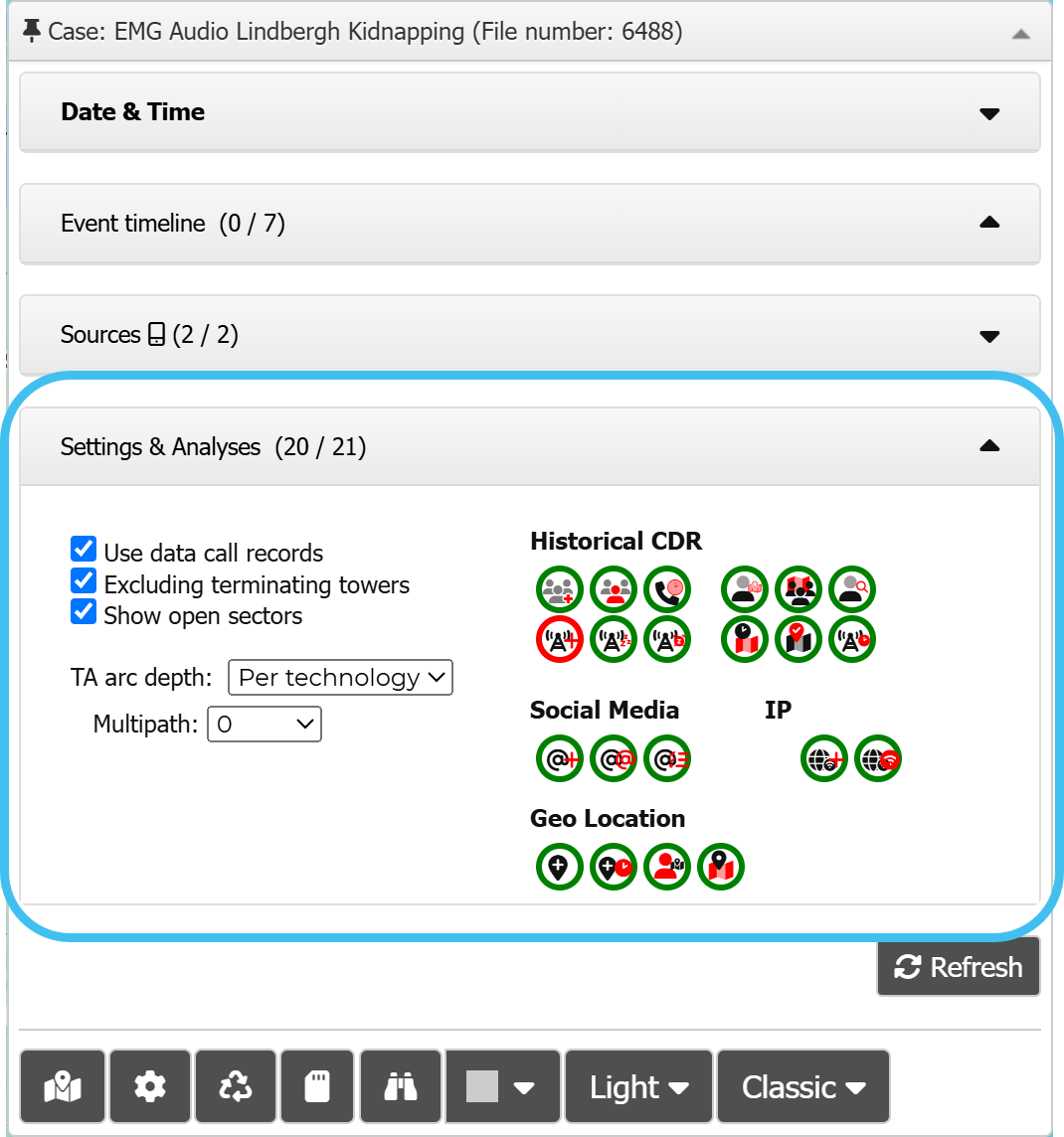 on the Call analyses and Geo-loc analyses tabs and on the Settings & Analyses section of the Input and settings view.
