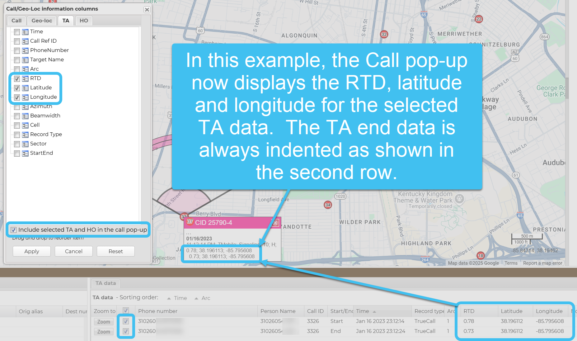 You can customize the order of the information displayed on the Call, Geo-loc, TA arc and HO pop-ups by selecting then dragging and dropping the items into the order you want them displayed. Note the Date item is always used to group the information on the Call pop-up, irrespective of its positioning in the list. Click here for a short video showing how to customize the order.