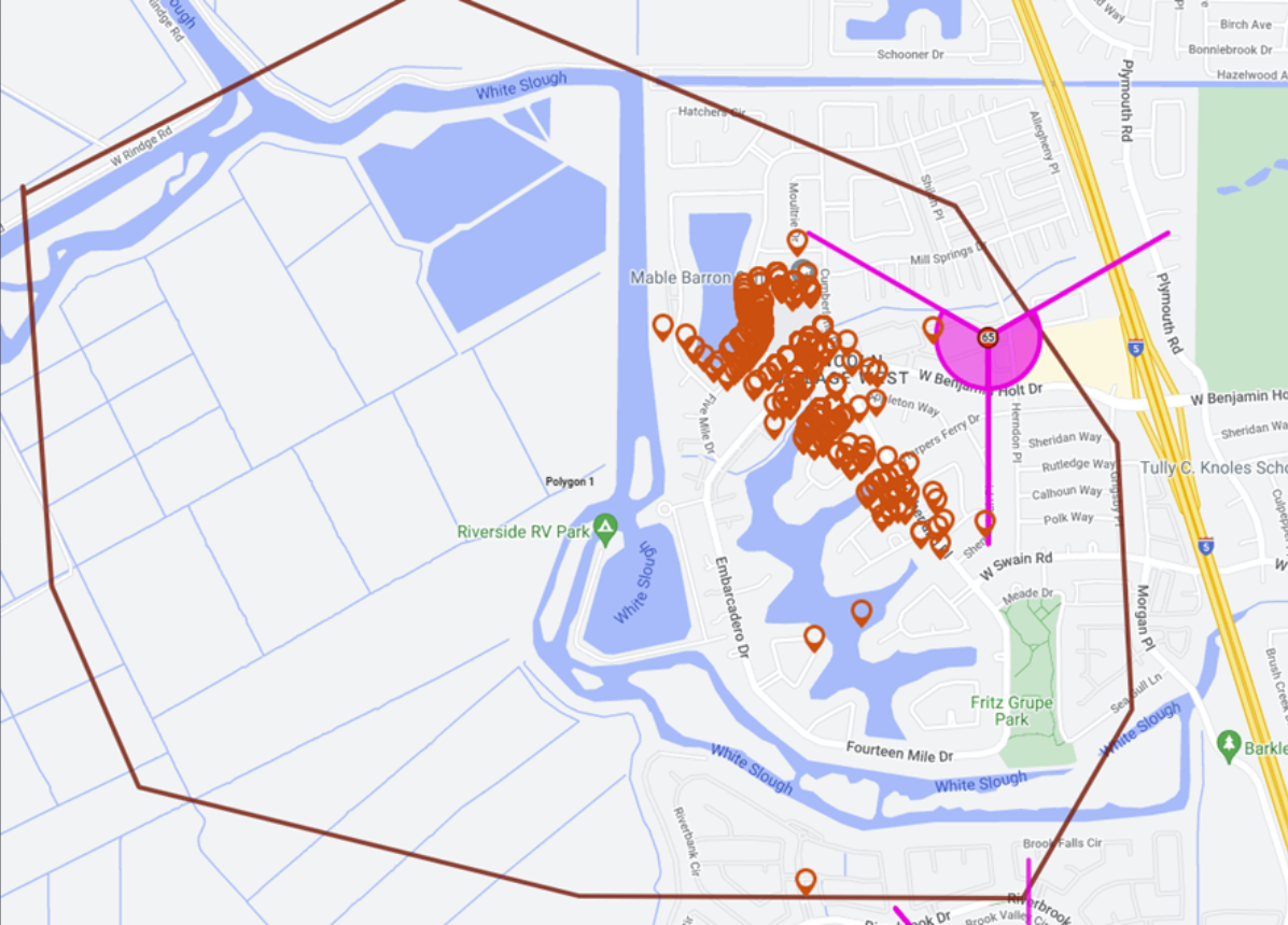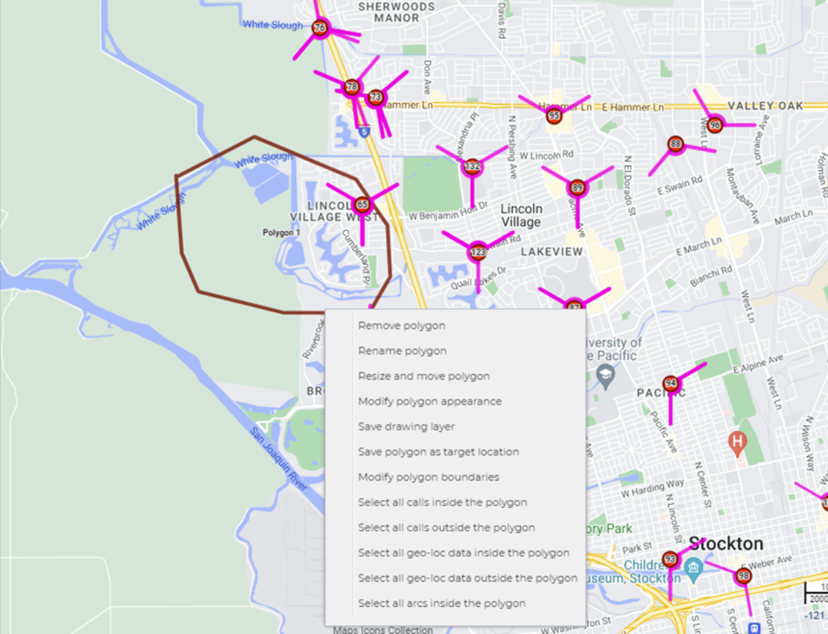 Polygon drawing mode allows you to draw polygons on the map which can be used for a number of reasons, for example to identify your drive area, create a target location, and to determine which data lies inside or outside the polygon, this can be helpful for example when you are analyzing where a target phone was based on timing advance or geo-location data.