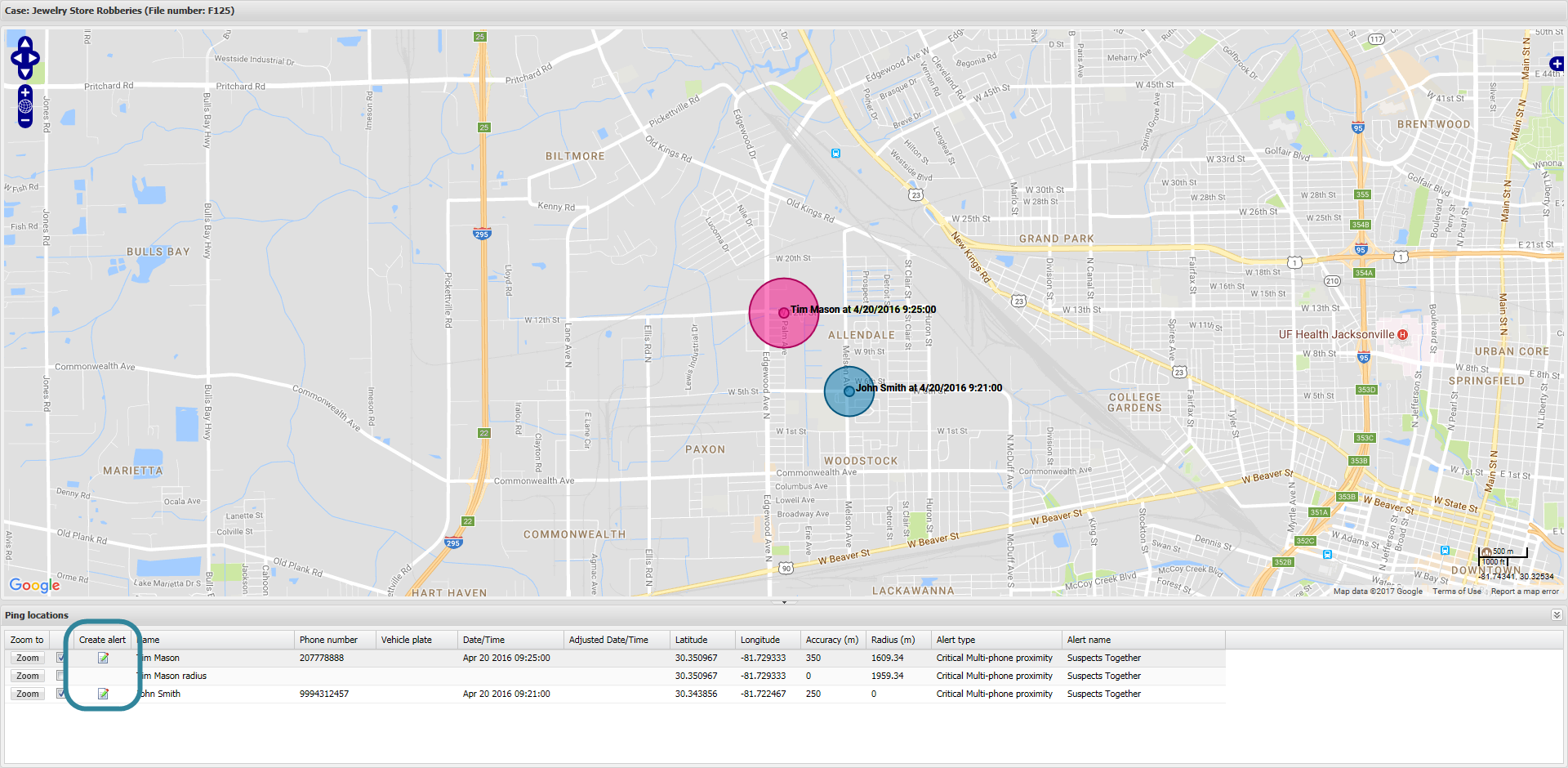 in the Create alert column. The Create an alert from selected location dialog box open with the latitude and longitude of the ping's location.