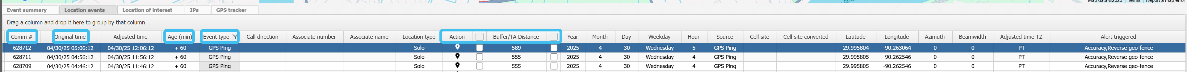 Click the Location events view. Columns of particular interest are: