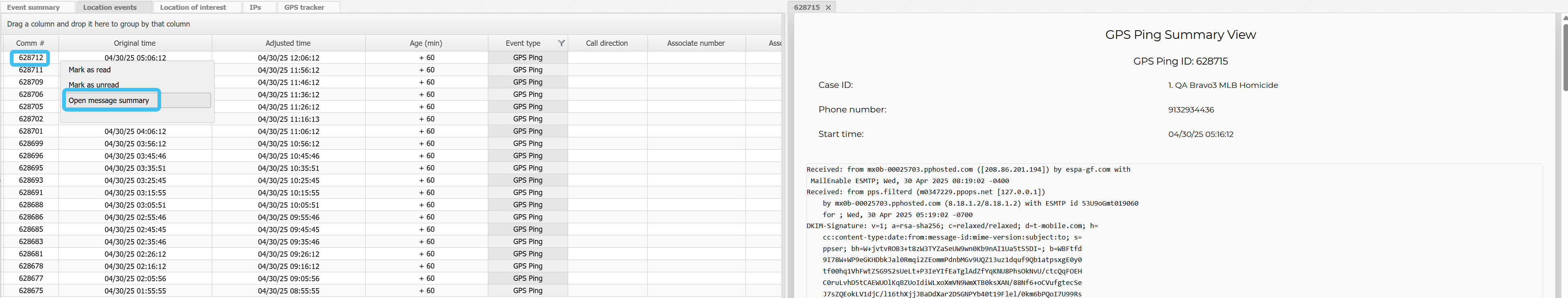 To review the original email, click the Comm #, or right-click on any row then select Open message summary, to open the message summary view.