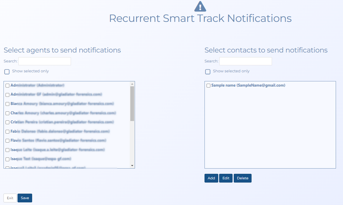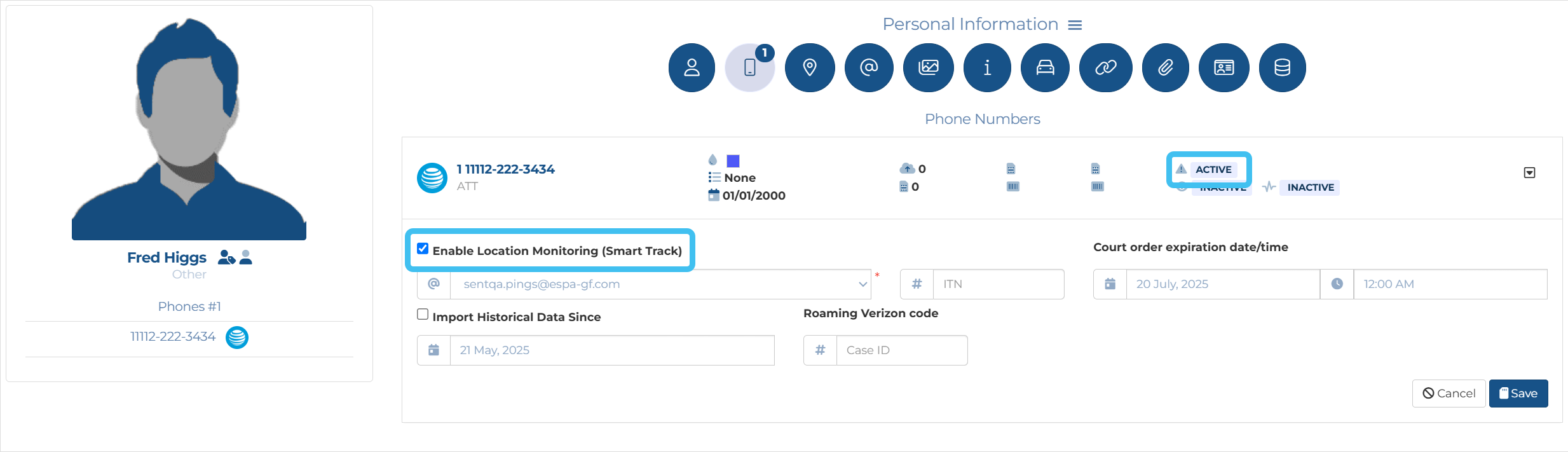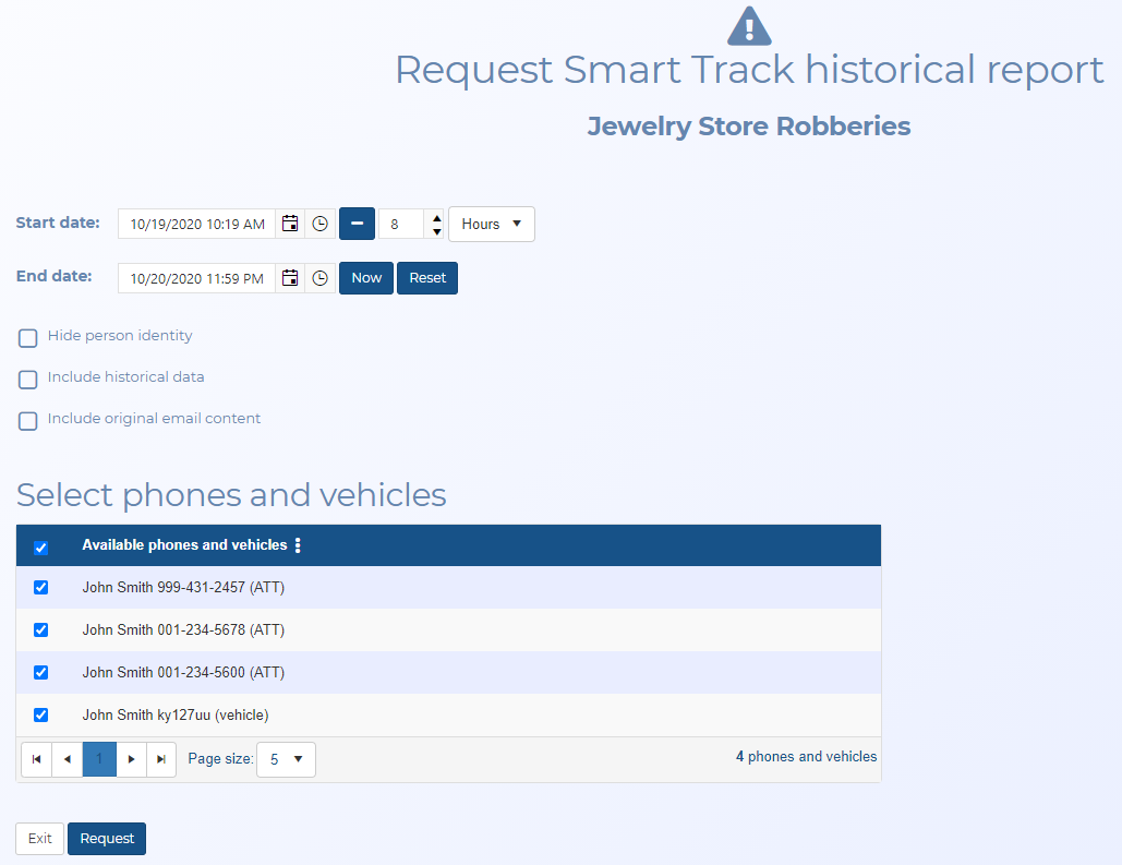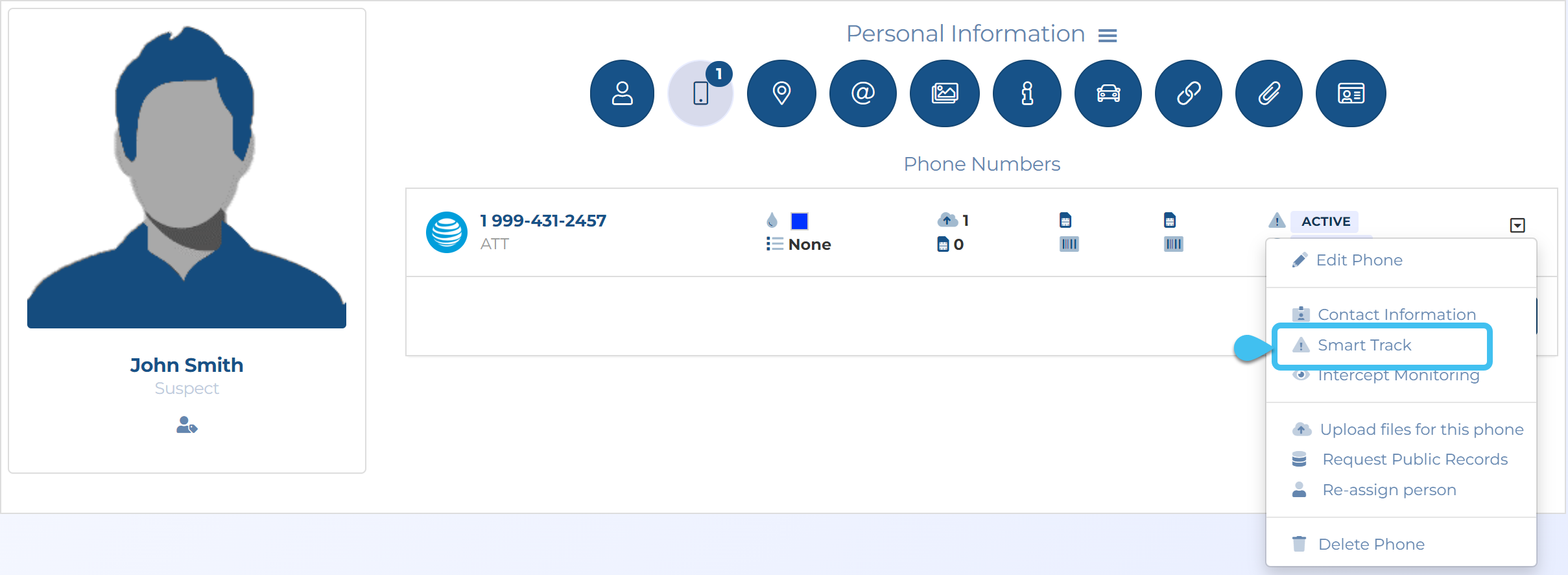 Smart Track provides you with a tracking and alert system. It performs tracking which is based on a GPS ping email interface and the optional intercept monitoring interface (i-case). Smart Track allows you to monitor a mobile phone's or a vehicle's movement and alerts you when certain conditions occur. OSS-ESPA automatically imports live location monitoring tracking events provided by the phone operators and license plate reader providers, and location information from social media locations. For phones this is currently only by ATT, T-Mobile, Sprint and Verizon. This type of event is generated periodically, for example every 5 to 15 minutes. For the optional electronic surveillance, the support is done via a live collection function interface with the operator. Smart Track also generates alerts for other conditions such as a phone being switched off.