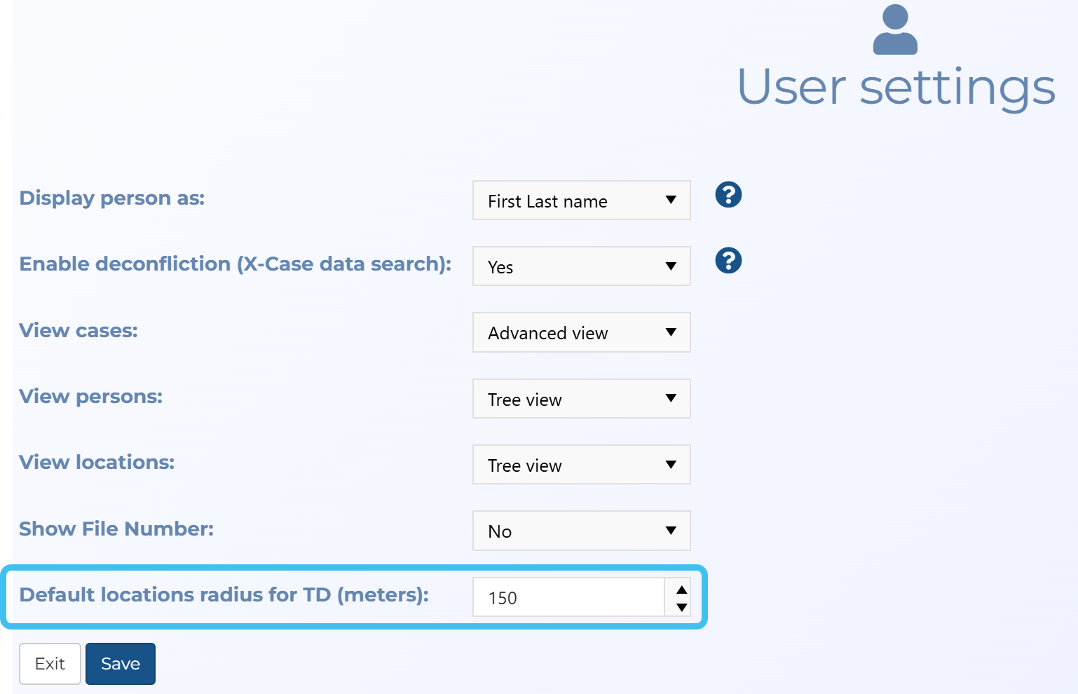 1. This step is optional. If you prefer to set all your location buffers to a specific distance rather than use the location buffer defined in the target development file then set Default locations radius for TD (meters) to your required distance. If this setting is left blank or is set to 0, then the location buffer in the target development file is used. To change this setting, from the main menu click Settings, Account settings, then in User preferences click Settings.