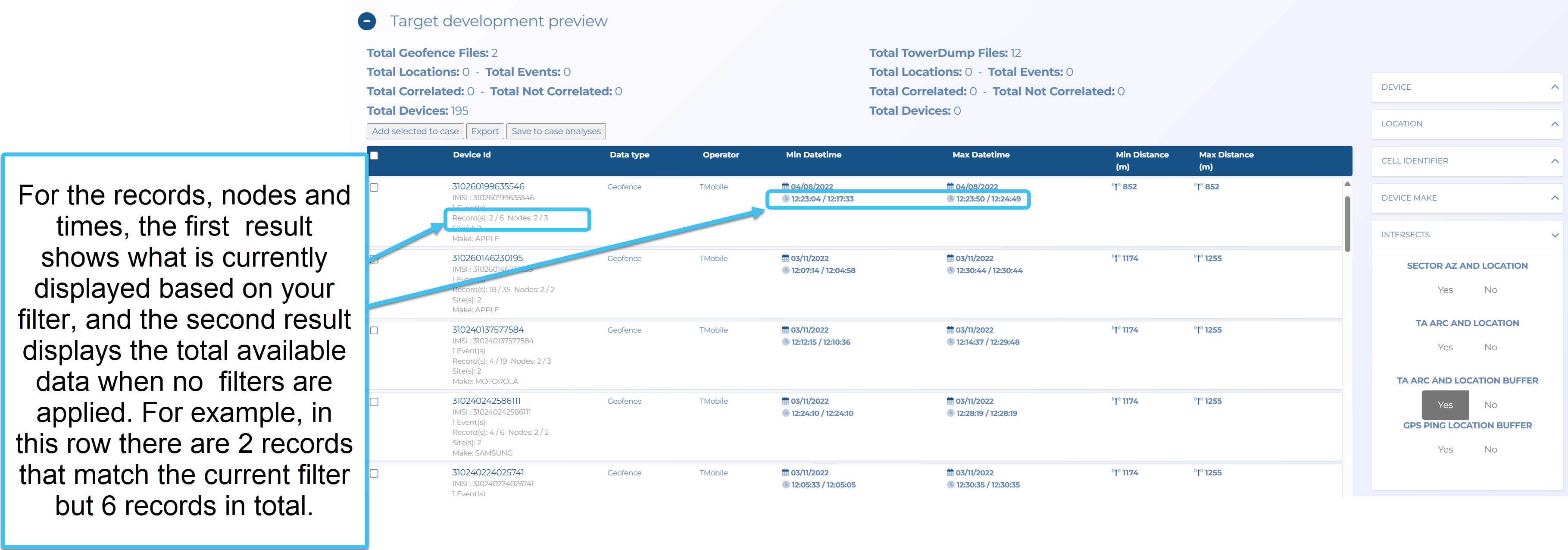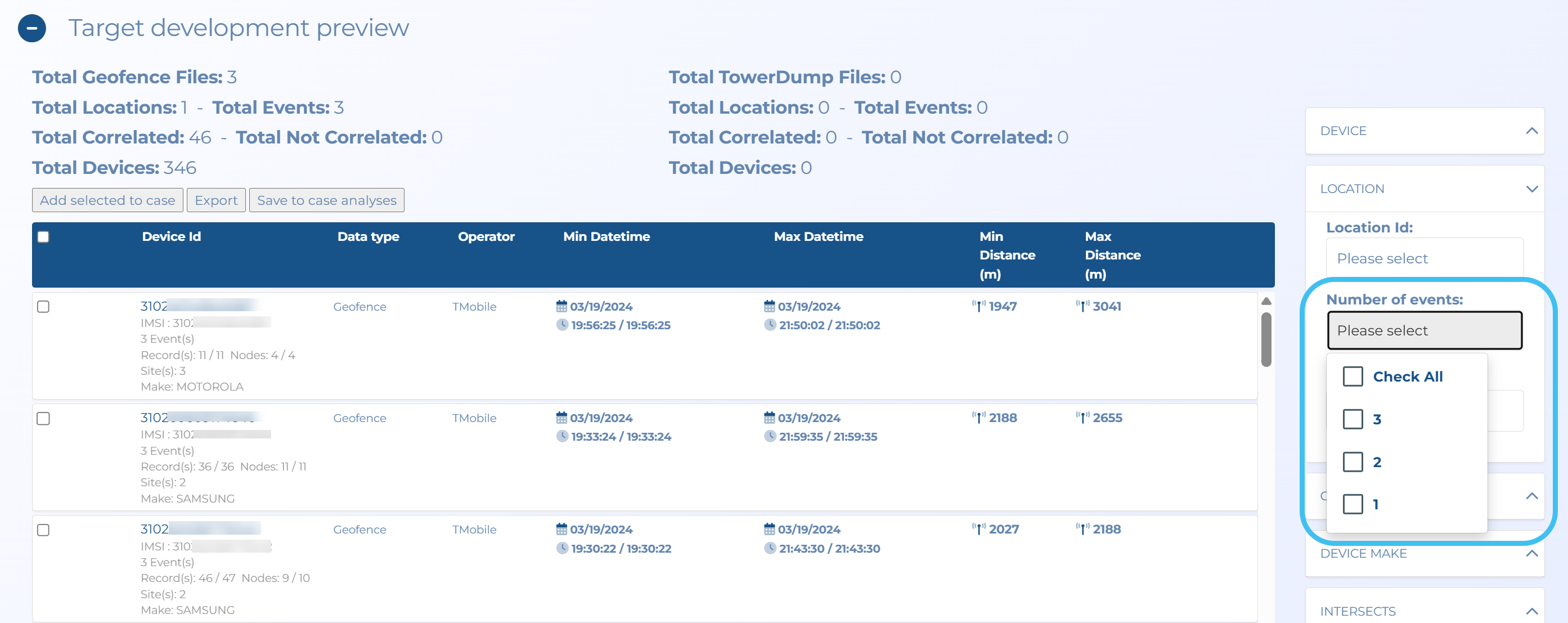 2. The filters to the right allow you to select what you want displayed in the Target development preview table. These filters allow you to filter based on one or more device identifiers, operator, data type, target buffer, location and the number of events and the events a device was found, cell identifier, sector, azimuth, intersects and correlation..