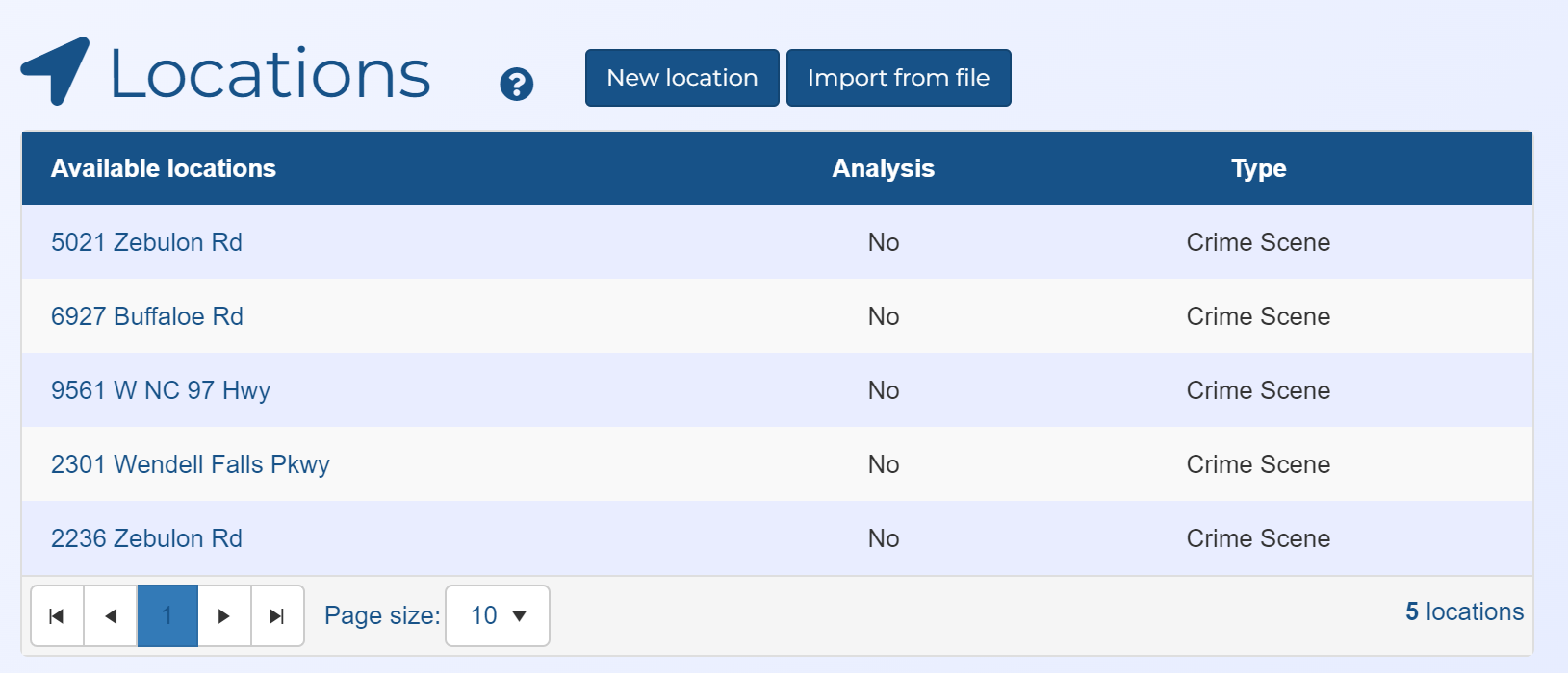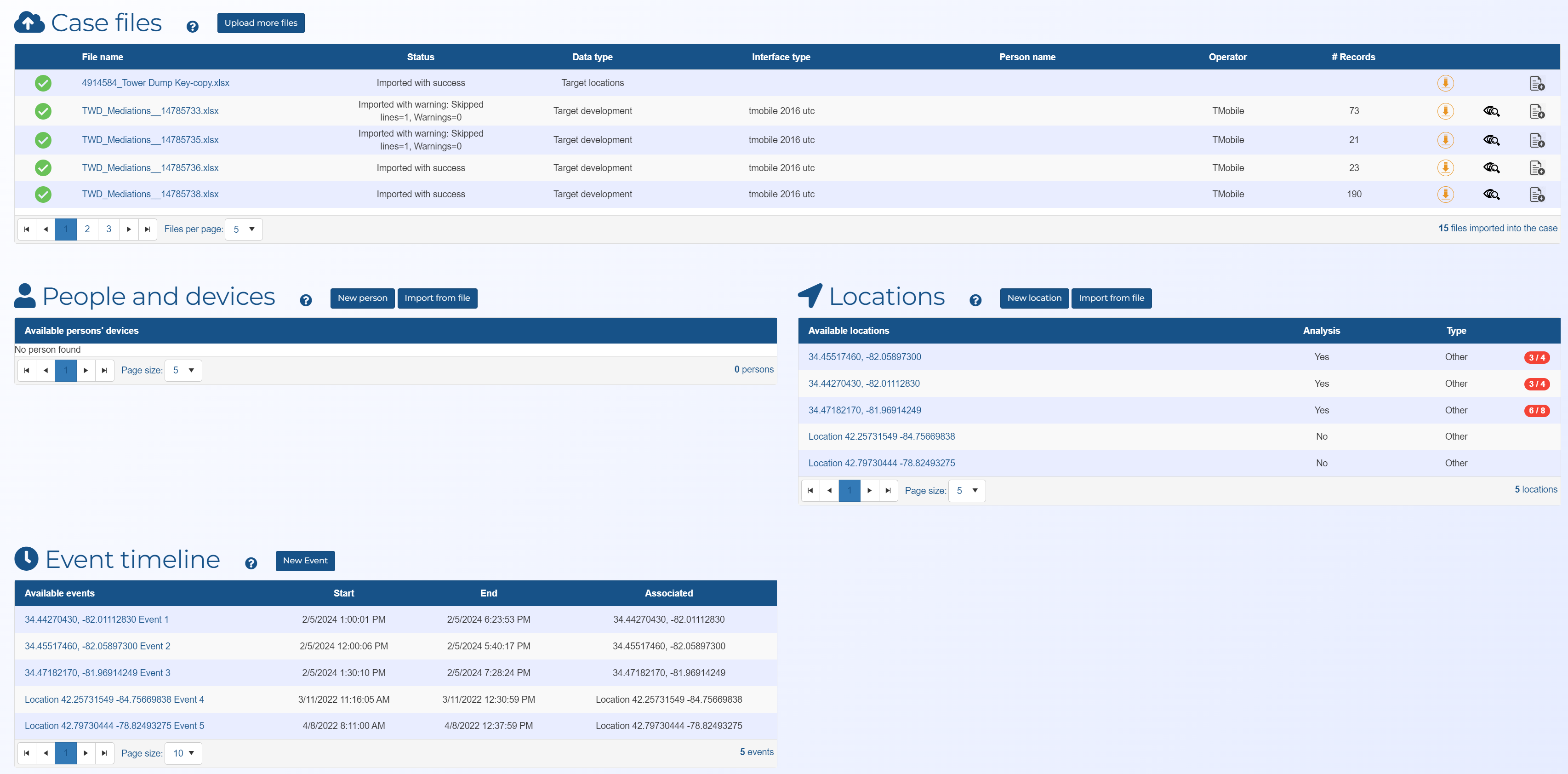 5. Once your files have uploaded they are listed in Case files; generic locations and events that were created are listed in Locations and Event timeline respectively. If required you can rename a location name by clicking Locations to open the Locations of interest screen, then editing and saving the location name. It is recommended you rename the latitude/longitude named locations to something more useful such as "Crime scene 1" and "Body recovery location". It is also recommended that a reasonably sized Location buffer is set, such as 25 or 50 meters.