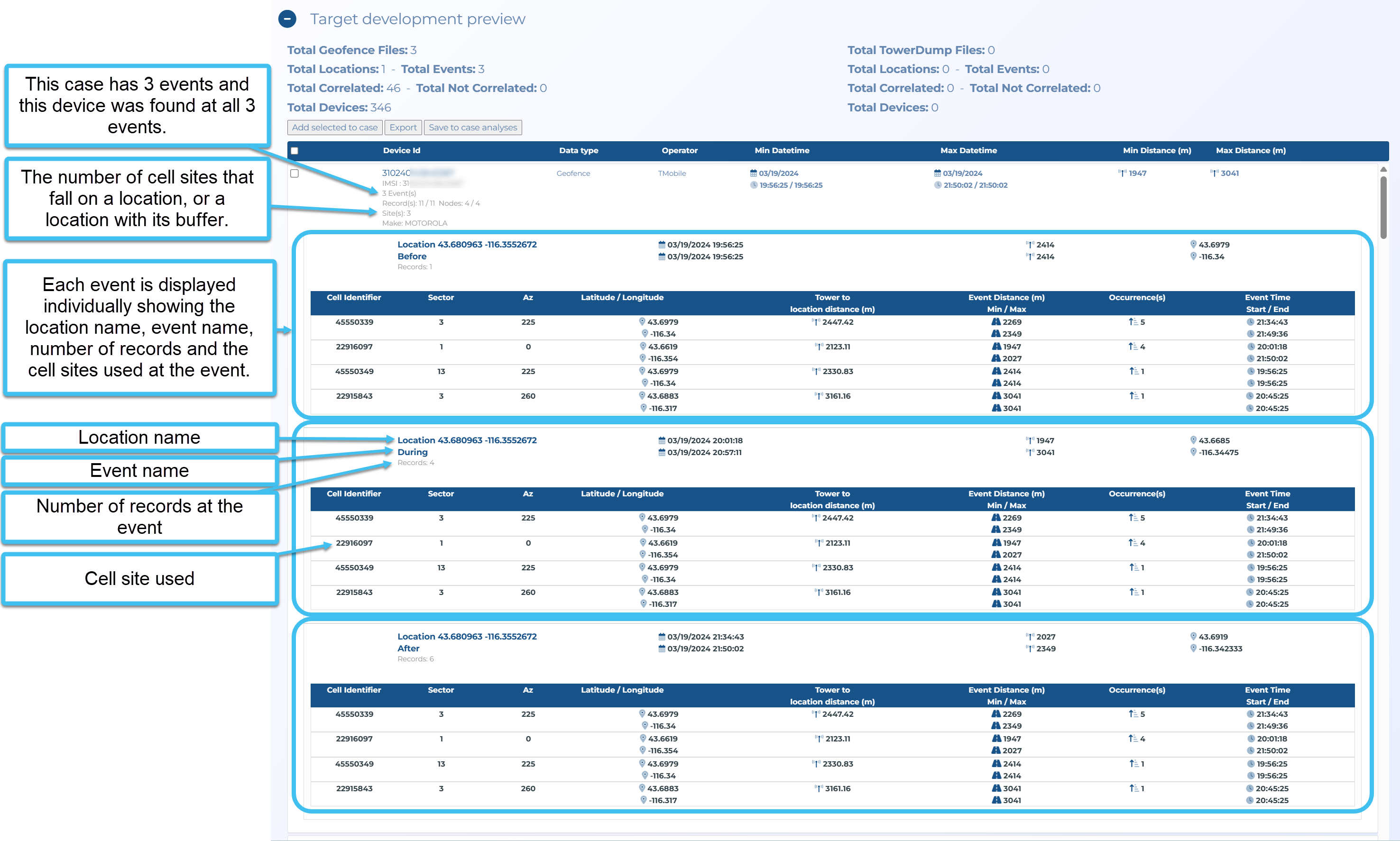 You can create and analyze geofence and tower dump files using the Manage file screen's Target development preview tab and the Target development view on the ESPA analysis center.