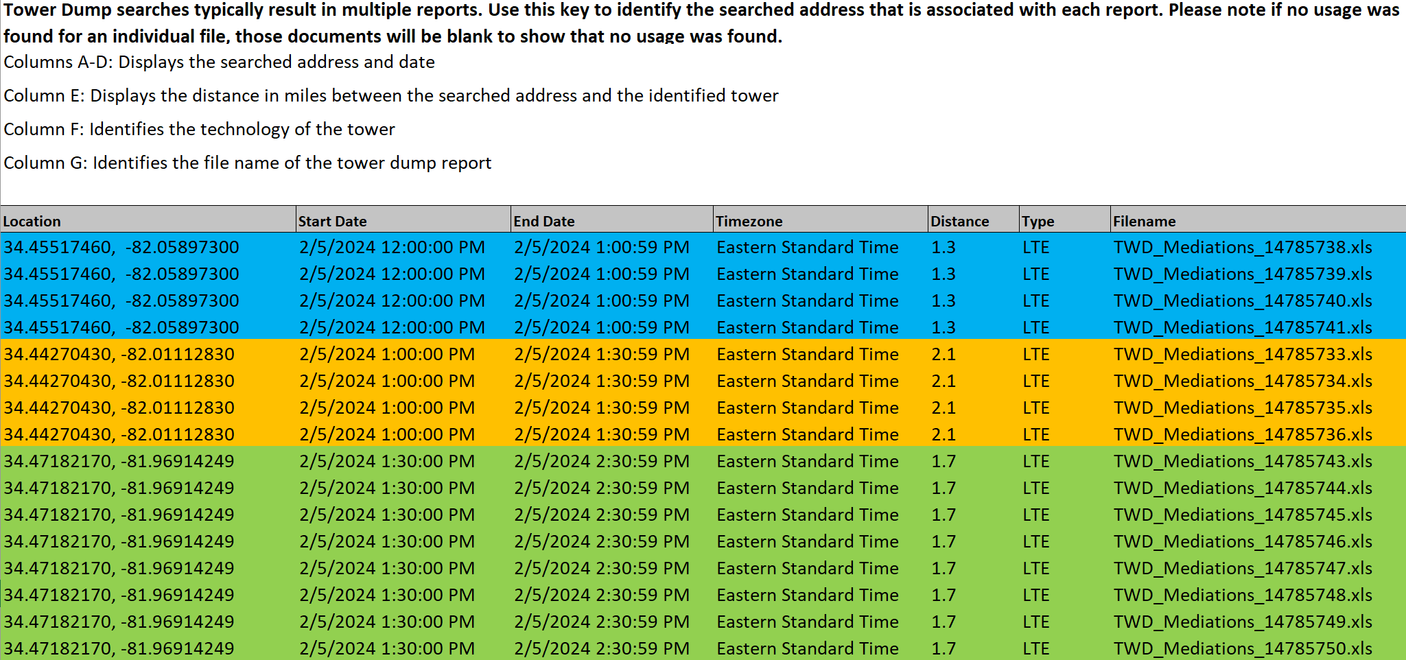 7. Before uploading your Verizon tower dump files you must open them to verify whether or not they contain locations. Prior to July 2024 the locations were not included in the files, but since July 2024 the locations may be included. If the location: