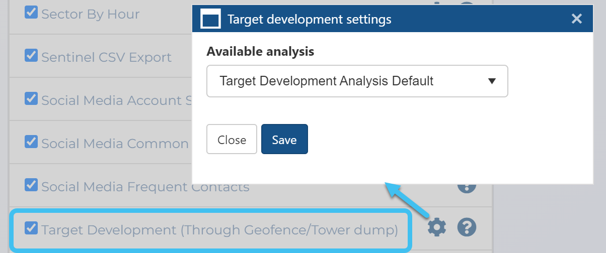 14. If you want to create an IQ packet report containing a target development analysis then create a custom report from the Custom IQ packet report settings screen containing the Target Development (Through Geofence/Tower dump ) IQ packet. The default analysis is always available but there may be additional analyses if you created any using Save to case analysis on your filtered selection. To select which analysis is used in the report, click then select from the available analyses.
