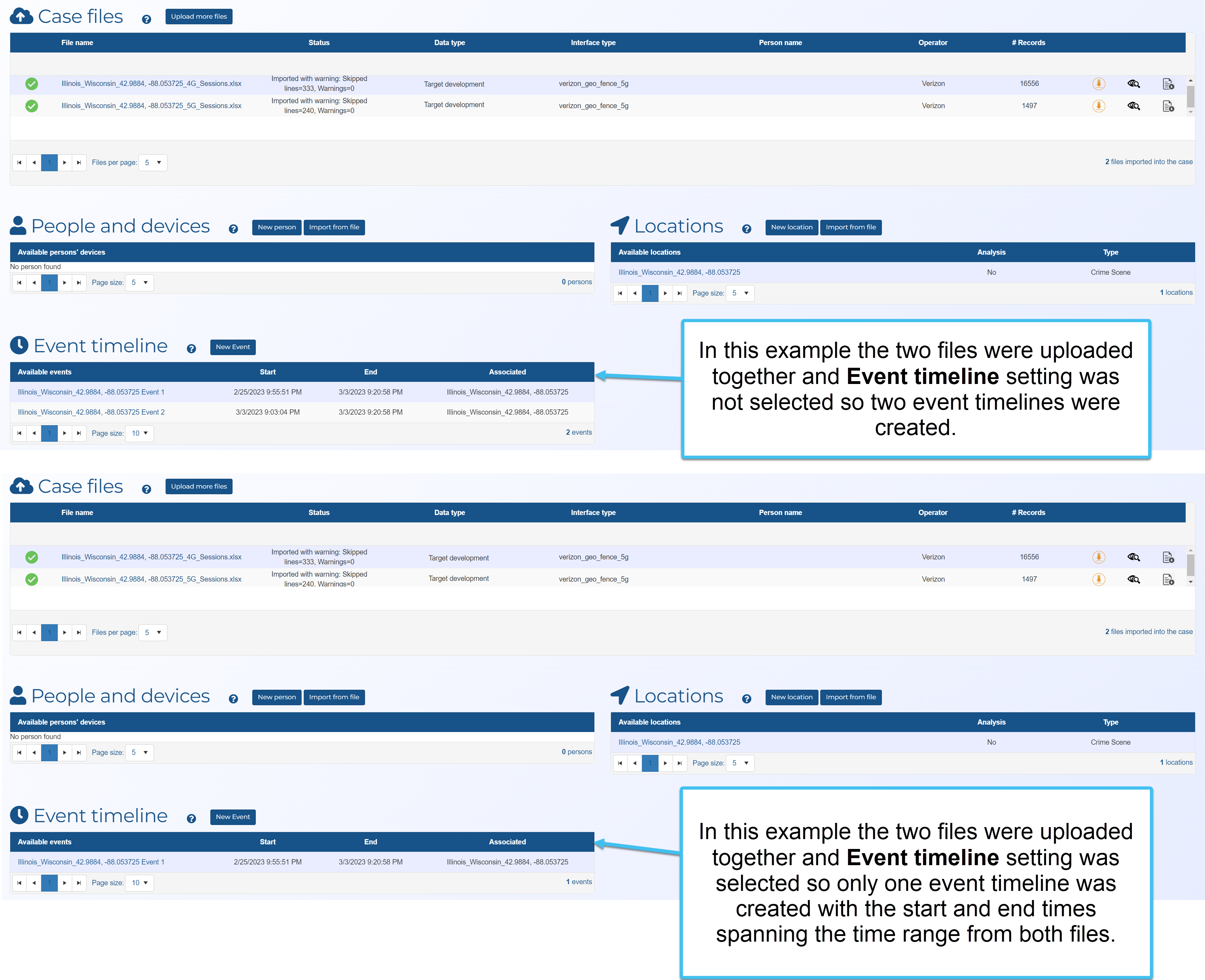 The following example shows two files that were uploaded with and without Event timeline selected.