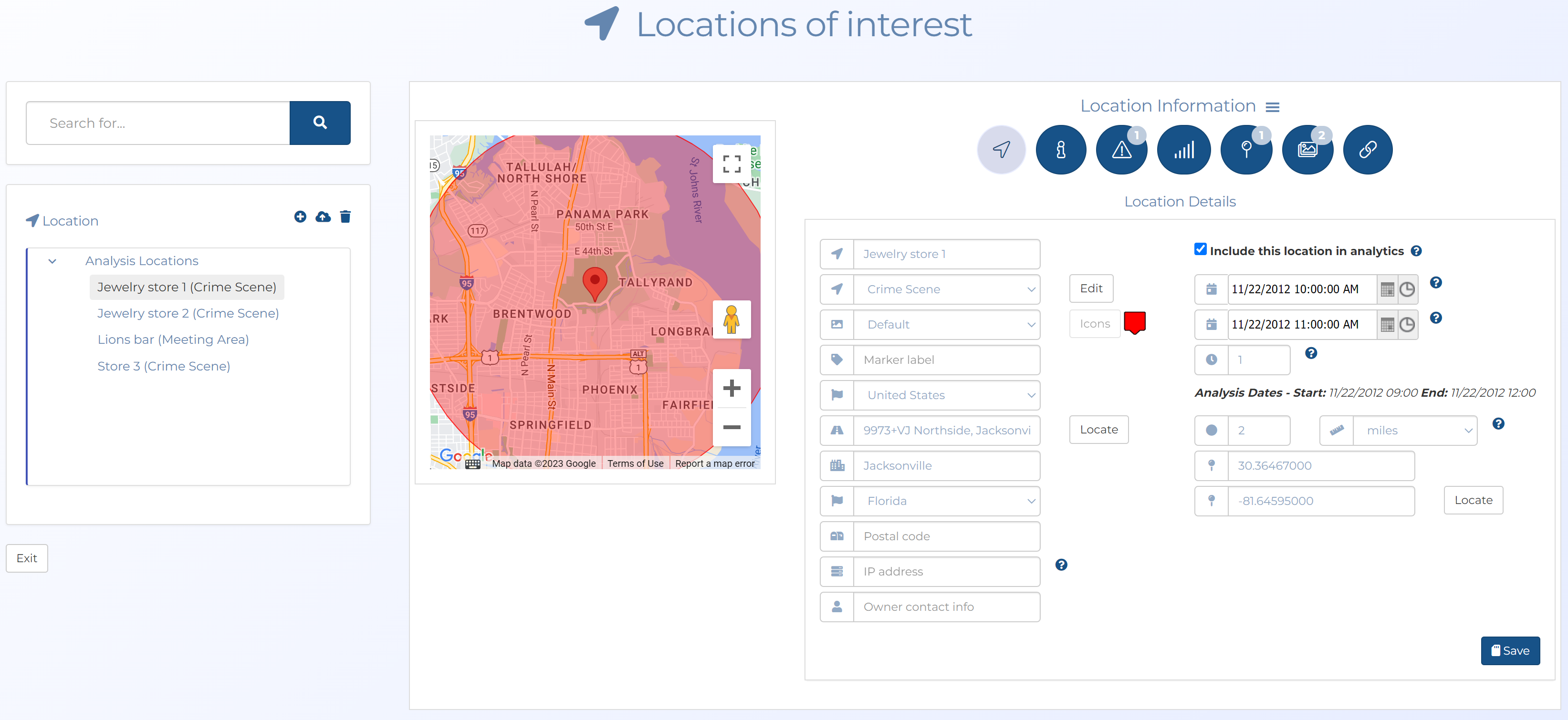 the second is referred to as an Analysis location, for example a crime scene, that compares the wireless records against the location producing a number of analyses that use the location. If you want the location included in analyses you must set the Time buffer, Event Start, Event end, Location buffer, Latitude and Longitude. You must also also select Include this location in analytics if you want to: For further information on location analysis, refer to Understanding location analytics.