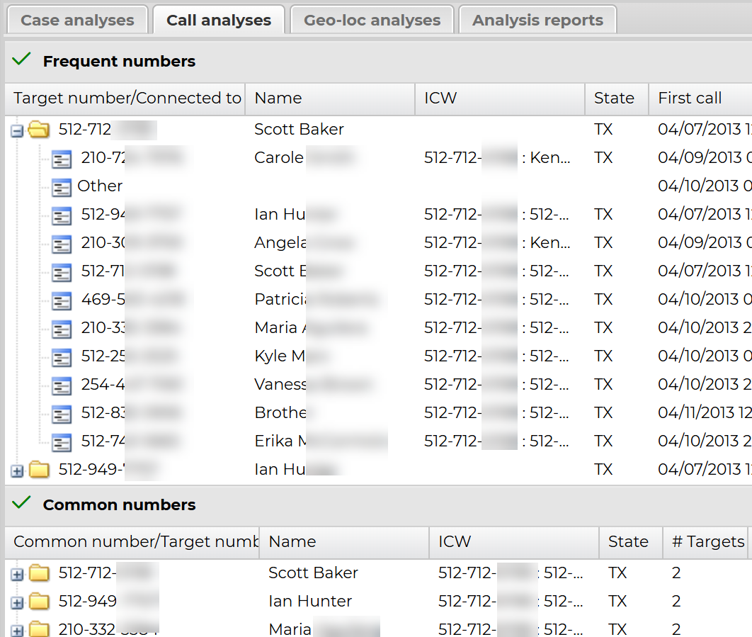 • The Advanced view cases screen allows you to perform a search on a phone number and displays all the targets the phone number is in contact with. For further information refer to Searching which targets a number is in contact with.