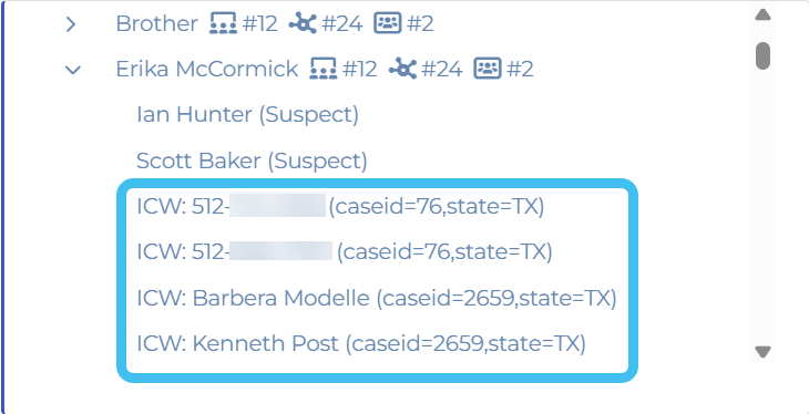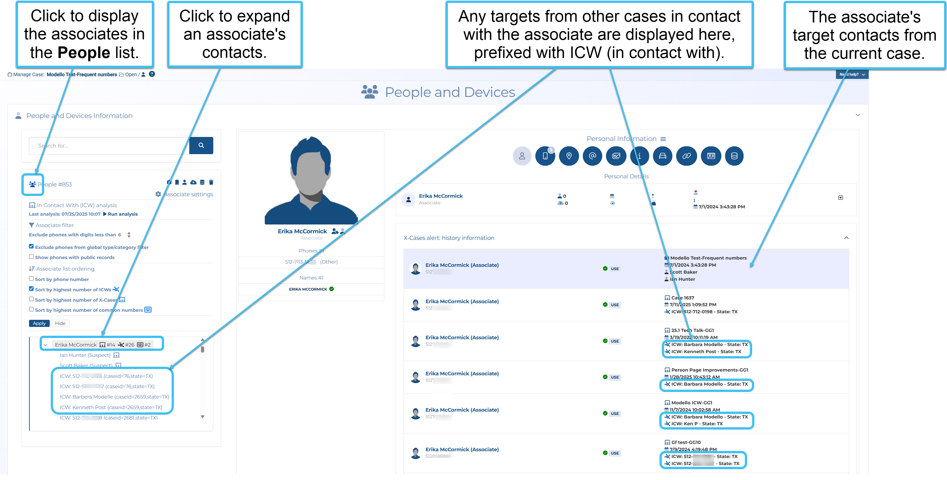 To display this information click on the associate phone number; any target names the associate has been in contact with are displayed immediately below, prefixed with ICW (in contact with), this information is also displayed along with the other case names in X-Cases alert: history information.