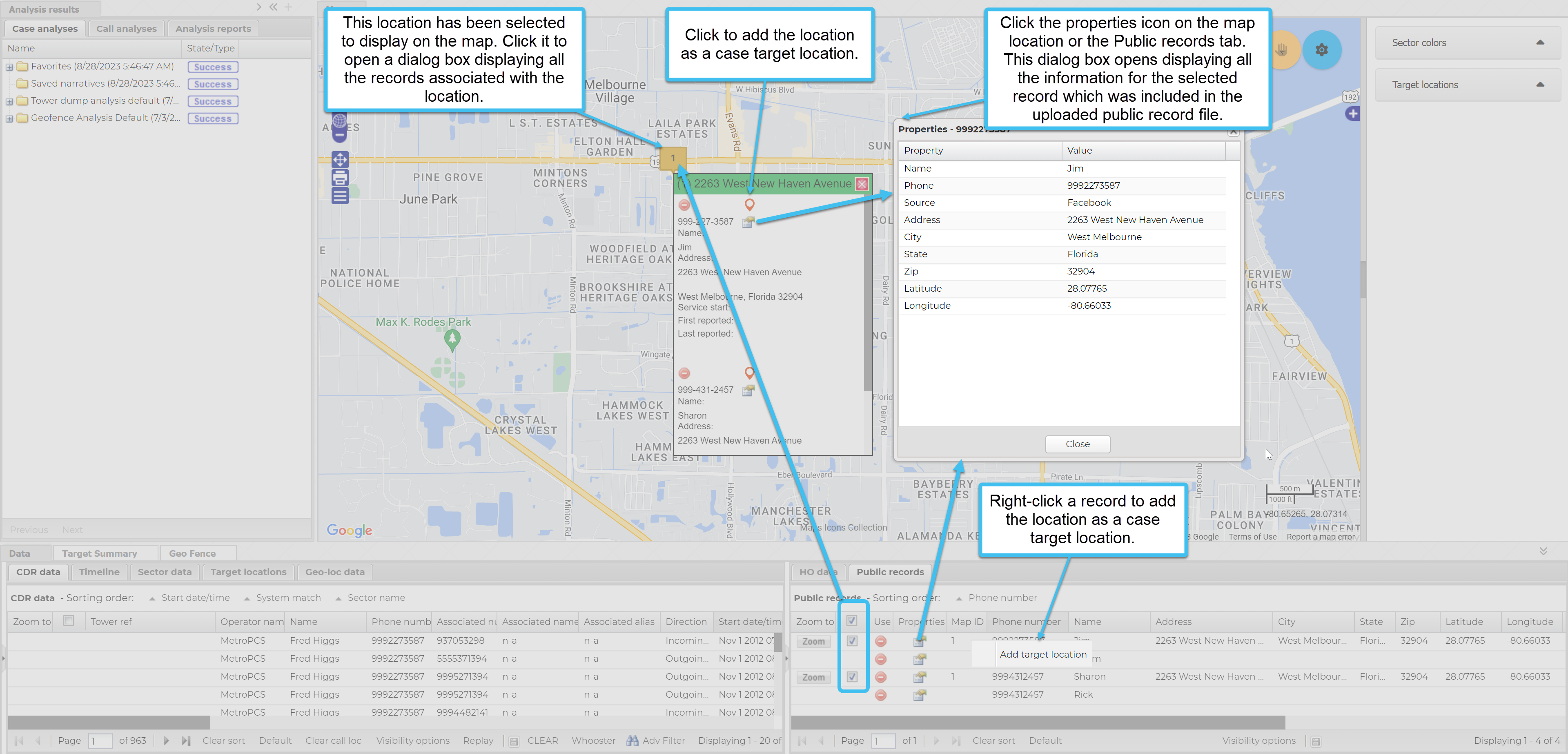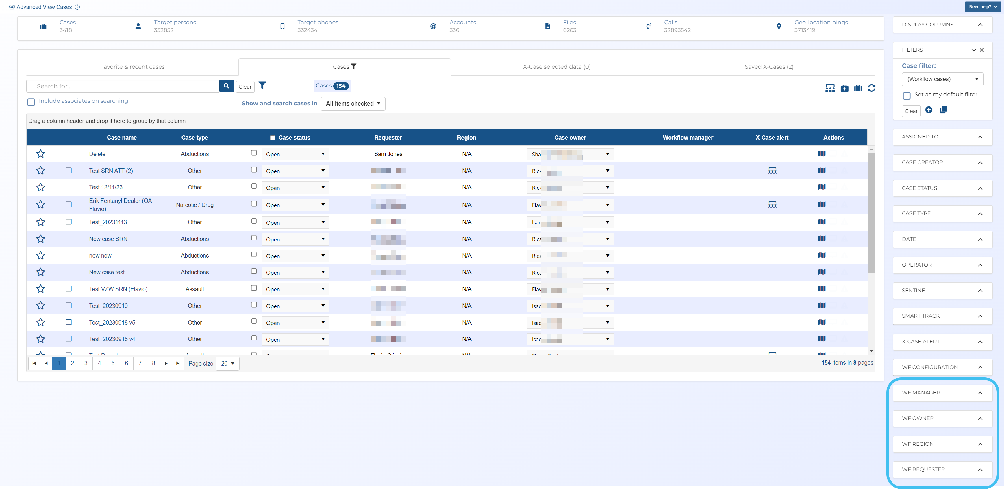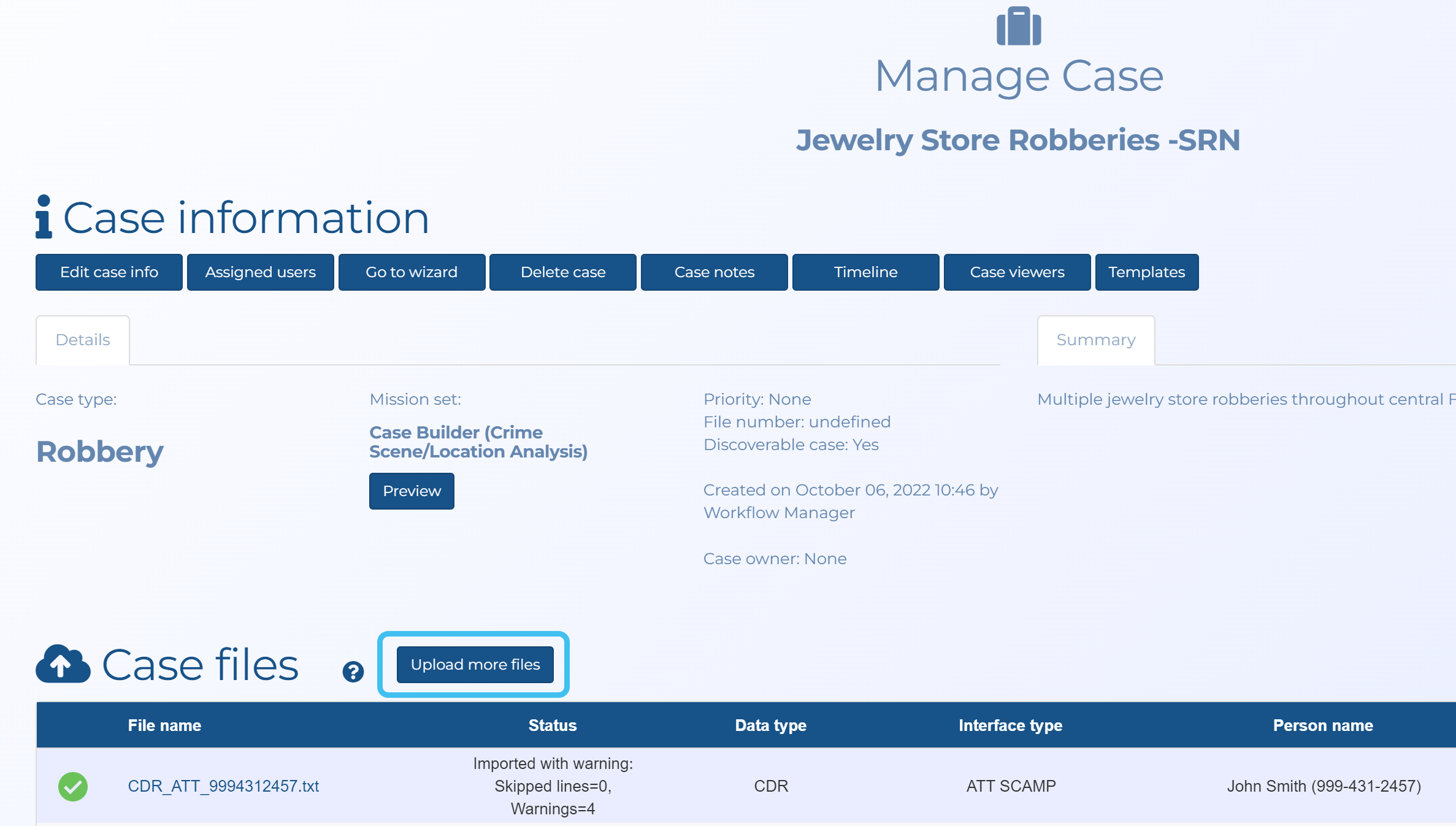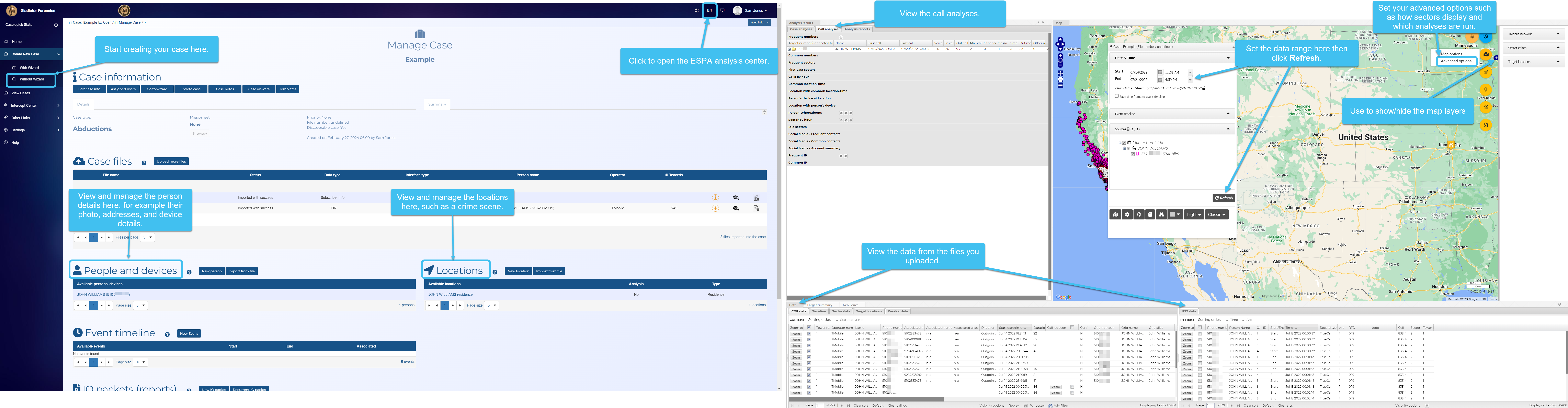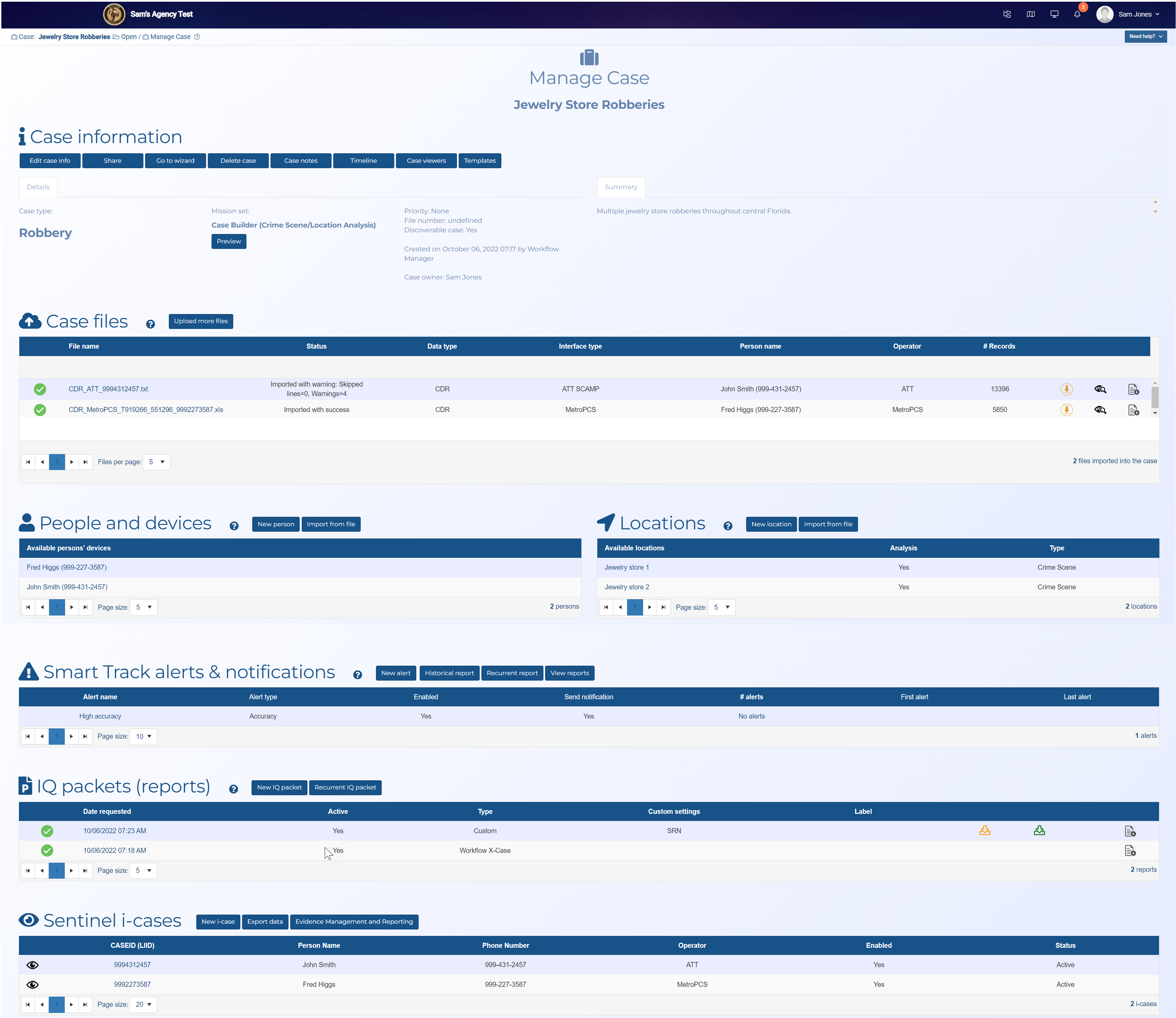 The Case management features allow you to create and manage your cases, and request and manage IQ packet reports. You can create cases for different purposes such as for: historical analysis, target development analysis (through geofence and tower dumps), live monitoring Smart Track, Sentinel intercept monitoring and Live wiretap monitoring. It is within Case management that you create the structure of you case, which may include: people, locations, timelines, i-cases, Smart Track alerts and files of interest such as CDRs (Call Detail Records), phone data files, public record files, geo-location files, geofence files, tower dump files, cell tower data, drive data, social media files,location files, person files, subscriber information and additional files.