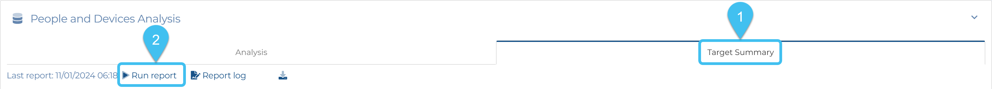 This topic describes how to run and view the target summary analysis on the People and devices screen which provides a simple method of generating and viewing the target summary data. It also describes how to download the HTML version of the report. If required, you can also create interactive Live target summary HTML reports which are sent to you by email, or are available to download as described in Viewing a Live target summary HTML report.