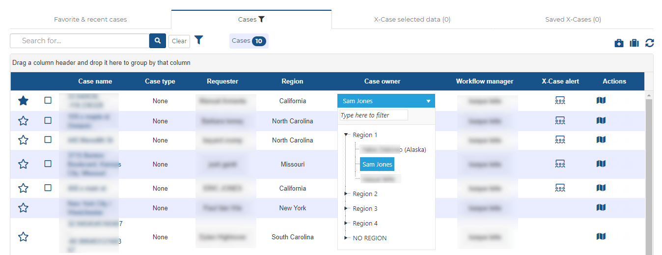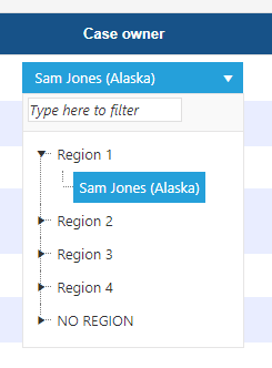 In addition, for ease of assigning case owners on the Advanced view cases screen, each user can also be assigned to specific regions. For example, if your organization works at a state level then each region could be a county. In the following graphic, the user is not a workflow manager but is responsible for Alaska this is displayed in the Case owner column of the Advanced view cases.