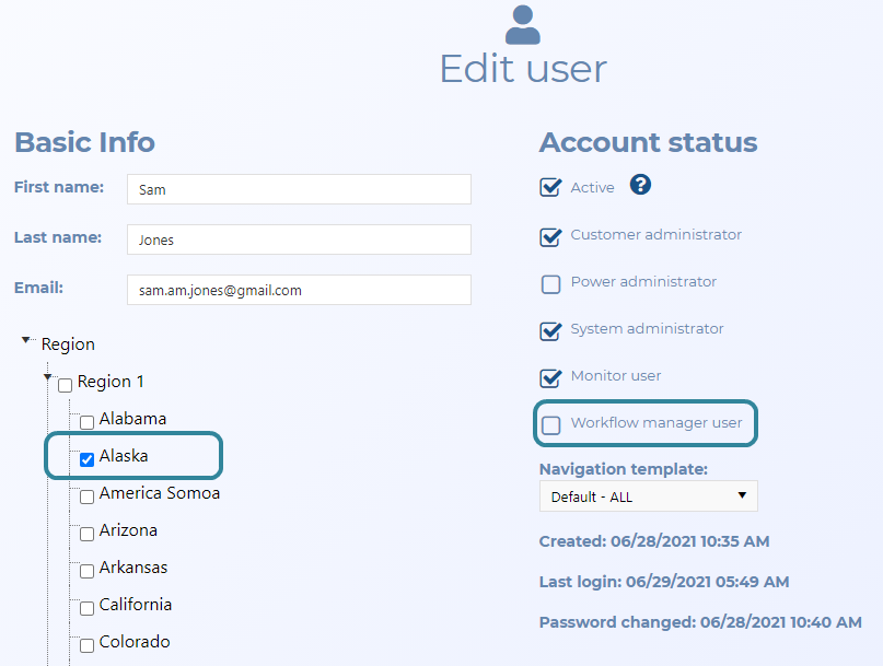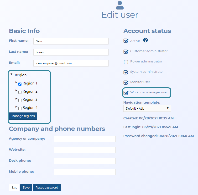 You can select a user as a workflow manager on the Edit user screen and you can select which regions they are responsible for. For example, in the following graphic, the user is a workflow manager responsible for Region 1.
