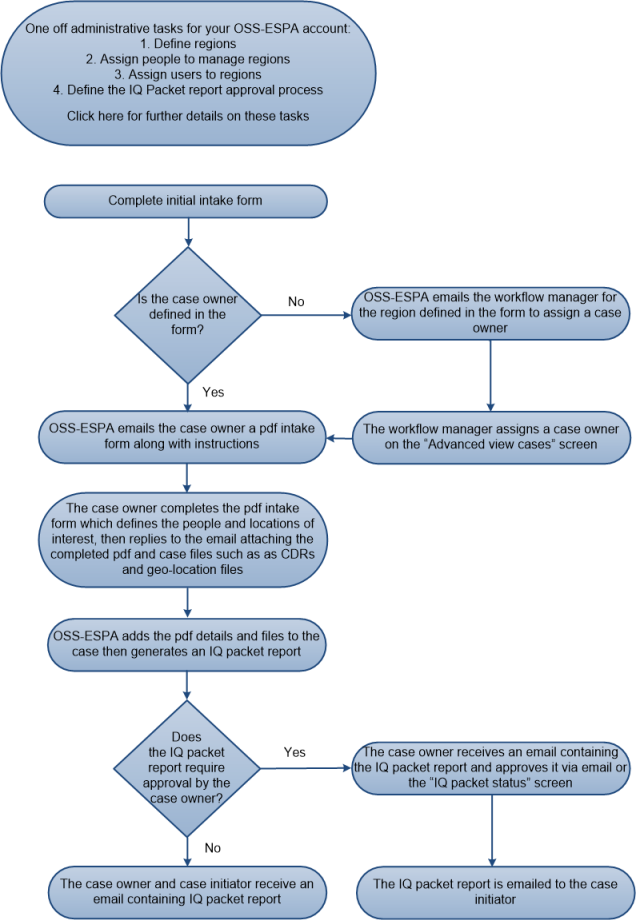 The client's workflow is initiated when an intake form for the case creation is submitted to OSS-ESPA. The submitter can either define the case owner in the initial intake form or leave the task of assigning a case owner to the workflow manager. For cases where no case owner is defined then the workflow manager who is responsible for the region, defined in the initial intake form, is notified by OSS-ESPA via email, and can quickly assign a case owner on the Advanced view cases screen.