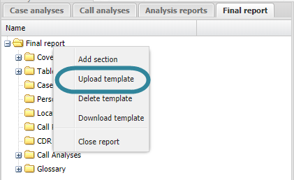 On the <Report name> tab, right-click the top level folder in the report, then click Upload template.