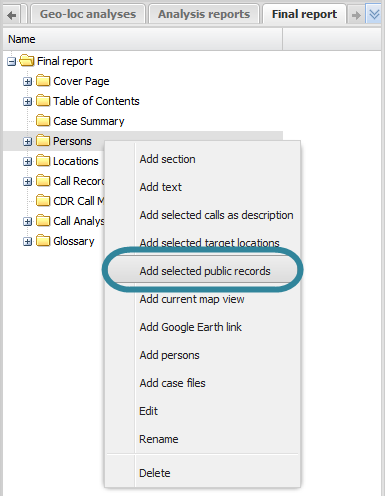 On the <Report name> tab, right-click the folder in the report to which you want to add the public record details, then click Add selected public records.