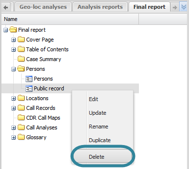 On the <Report name> tab, locate the position in your report for the public record item then right-click and select Delete. Click OK on the Delete section dialog box to remove the public record item from the <Reports name> tab and as content within your report when you run a new version of your report.