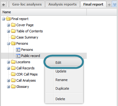 On the <Report name> tab, locate the position in your report of the public record item then right-click and select Edit. This causes the ESPA analysis center screen data to be refreshed.