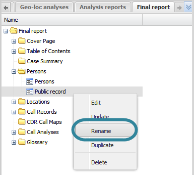 On the <Report name> tab, locate the position in your report of the public record item then right-click and select Rename.