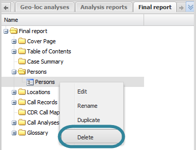On the <Reports name> tab, locate the position in your report for the person item then right-click and select Delete. Click OK on the Delete section dialog box to remove the person item from the <Reports name> tab and as content within your report when you run a new version of your report.