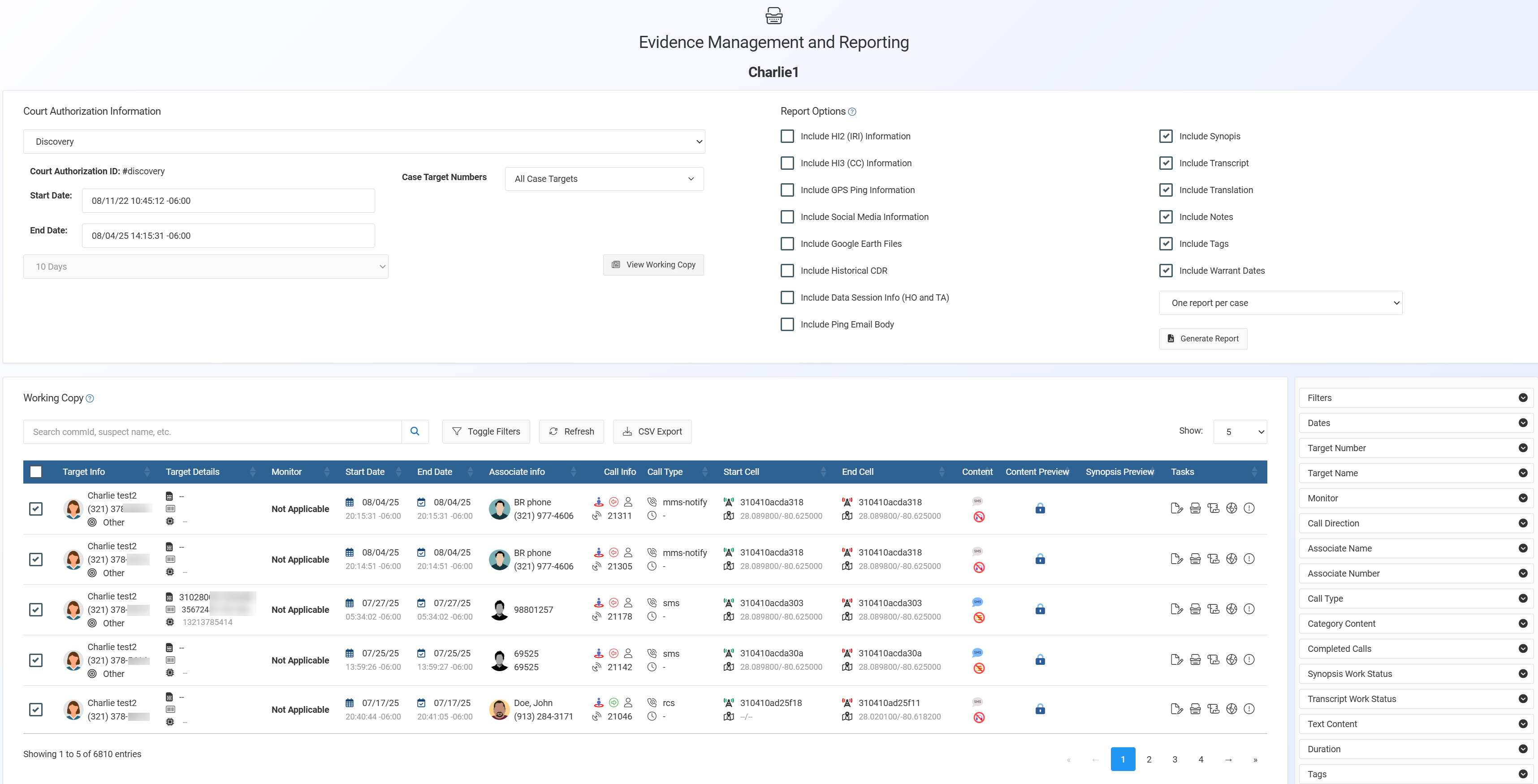 You choose which of the three report types you want to generate, then select the pertinent events. The 10 Day and 30 Day reports provide you with the data to present to court if you wish to continue monitoring a subject after the first 10 days or if you need to request permission to extend the previous 30 day warrant. The Court Authorization Period report contains all intercepted data including voice and SMS content over the court authorization period and can be provided to the prosecuting attorney or defense as a complete package. The Discovery report allows you to define the start and end dates of the intercepted data that you may want to include in your report.