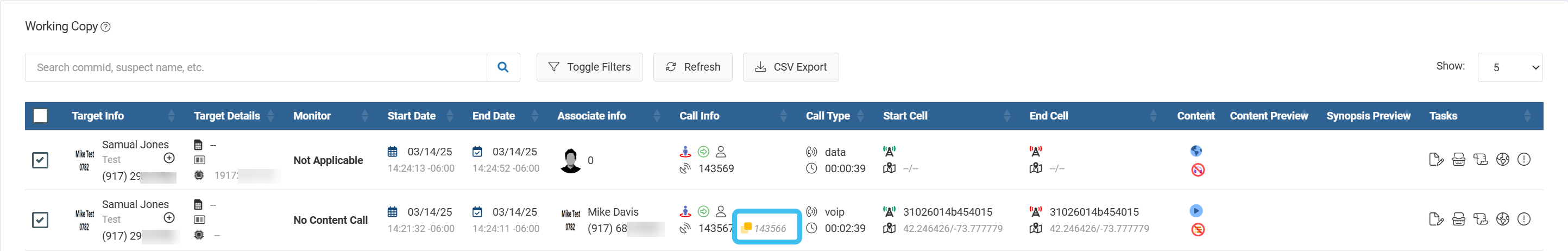 The first is the basic search field, situated above the table, that allows you to search for column information such as a target number, target alias, monitor name and communication id. This filter also searches for tags within your notes, synopsis and transcripts.