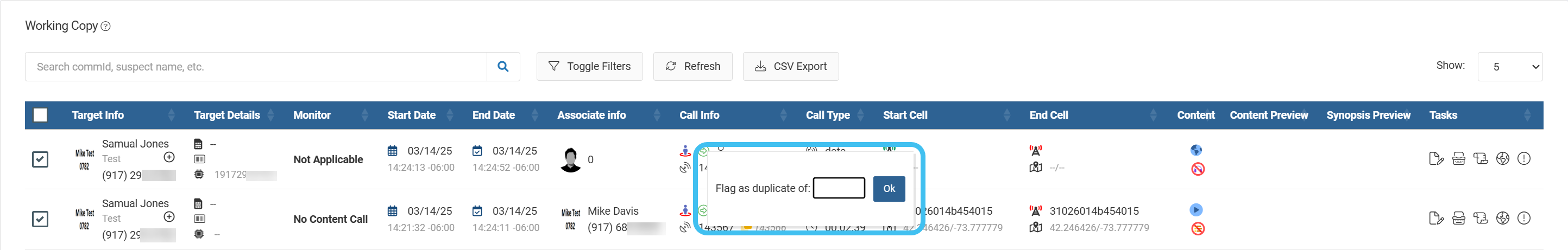 There are occasions where it is not possible for OSS-ESPA to detect a communication is a duplicate, and in this instance you can use this column to mark a communication as a duplicate. For a communication to be marked as a duplicate it must have the same: target phone number, associate phone number, communication type, call direction, and the call timespan must be the same +/- 30 seconds. To mark a communication as a duplicate, right-click the communication number and enter the other communication number.