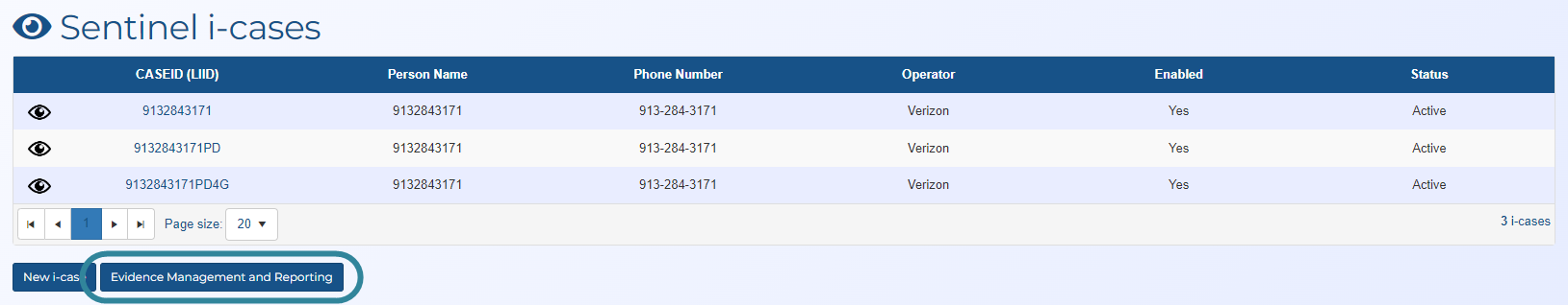 The Evidence Management and Reporting screen can be opened either by clicking Evidence Management and Reporting under the Sentinel i-cases section on the Manage case, or by clicking the new