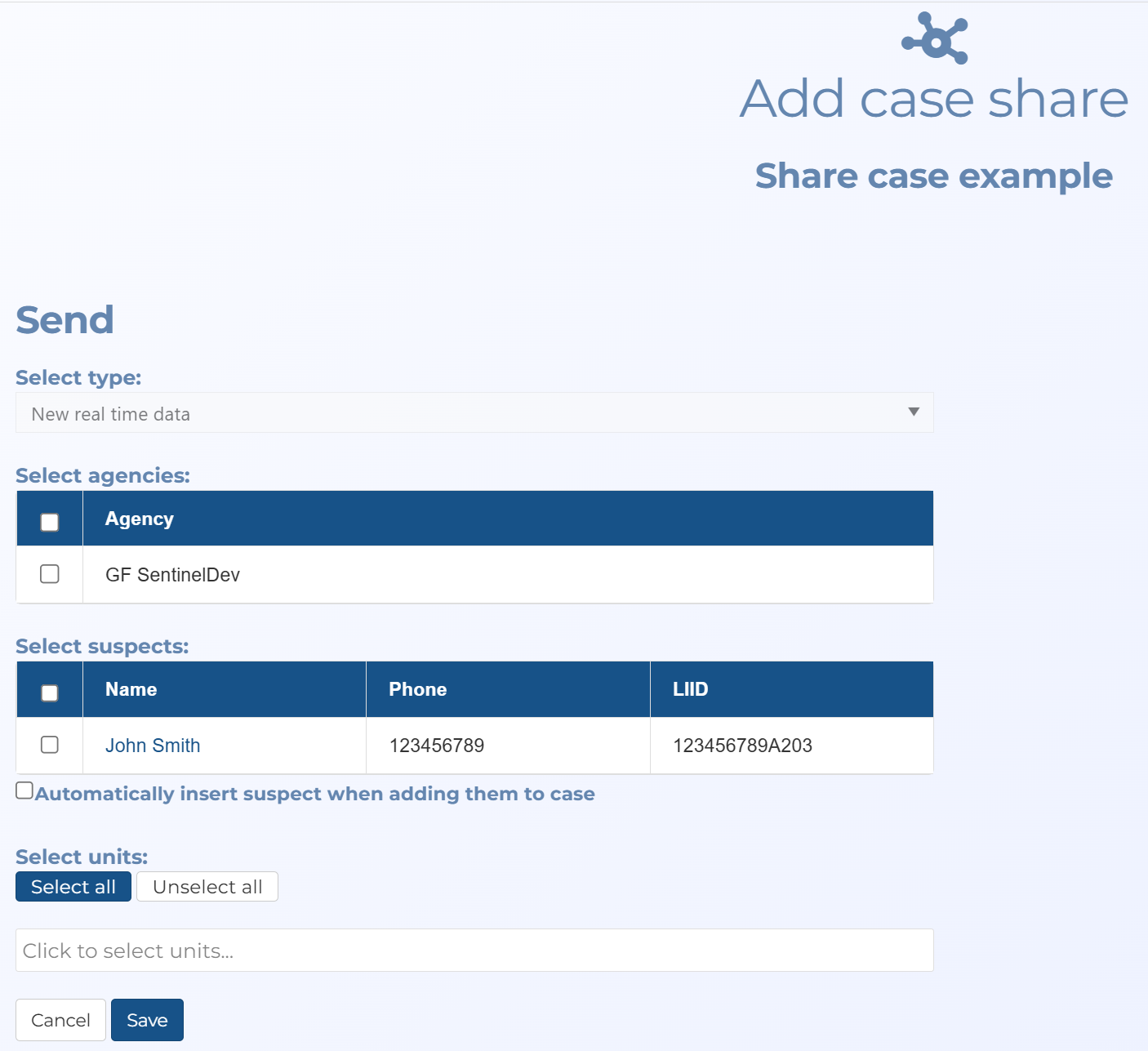 This topic provides an overview of the Add case share screen and all the settings and buttons on it. However if you require step-by-step procedures on sharing case data with other agencies or field units refer to Sharing cases.