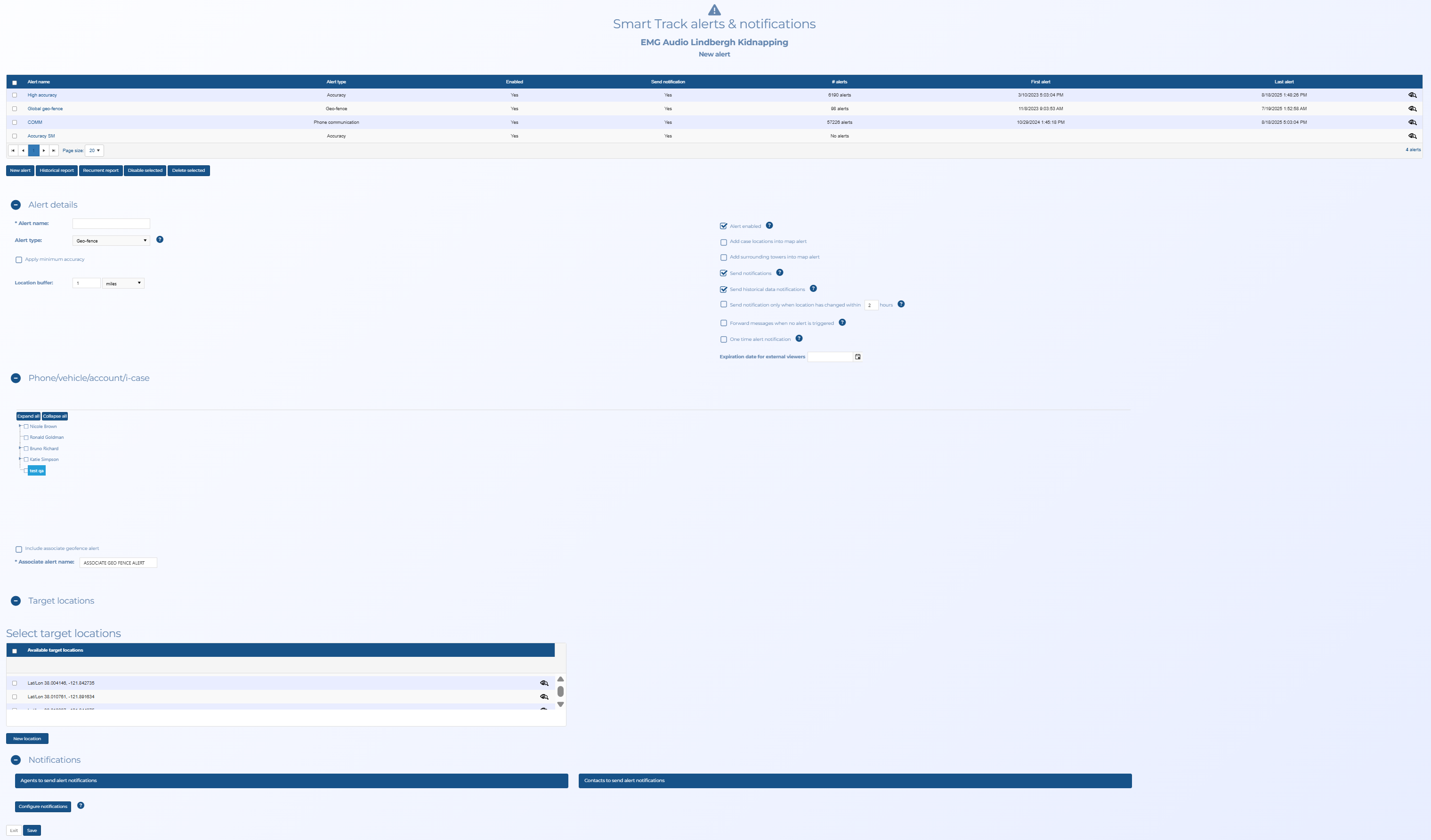 If your OSS-ESPA account is using global locations, then any global location Smart Track alerts are automatically added to your case. This screen identifies these alerts as Global geo-fence and Global reverse geo-fence alerts as shown below. These alerts are typically added for locations of general interest, such as airports, but you can disable the alert if you prefer. For further information refer to How to create a Smart Track alert on a global location.