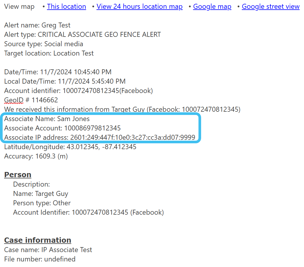 When OSS-ESPA receives the live location monitoring email from the provider it imports the event data and verifies the location of the event. If an alert is triggered, or if you have the alert configured to forward all events received from the provider, then OSS-ESPA sends a notification informing the case creator, case assignees, and other email addresses configured for the alert, of the location of the phone or vehicle in respect to the alerts that you have configured. The email also includes