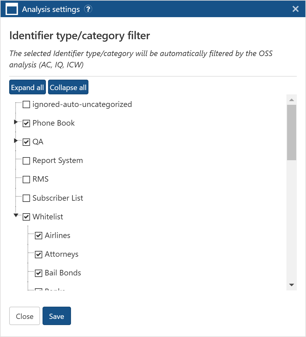 The Analysis settings dialog box allows you to manage which types and categories of global identifiers are used in the analyses. This ensures that the analysis results that are of most interest to your users are displayed. Once you have set this, users can apply this selection to their analyses on the ESPA analysis center, IQ packets and the ICW (in contact with) analysis as shown in the following graphics.