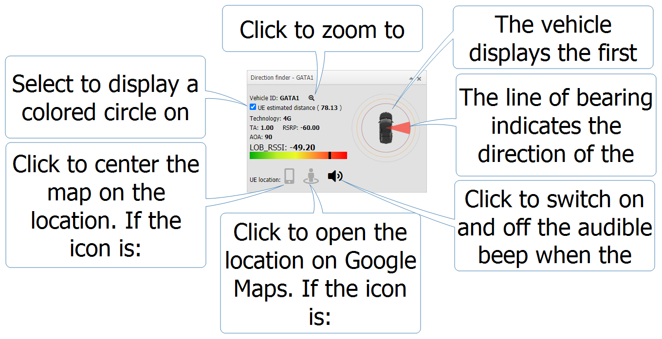 The Direction finder pop-up is displayed on the Sentinel screen. It displays information gathered from GATA (Gladiator Autonomous Target Acquisition) field units which can help you find devices of interest. The pop-up displays the: current or last known location, the signal strength, the line of bearing, and the distance from the device.