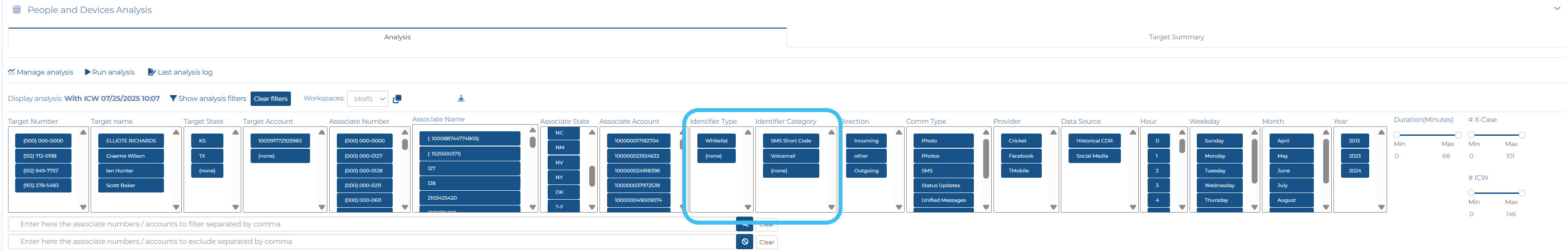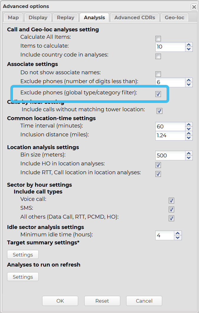 Click to open the Analysis settings dialog box which allows you to manage which types and categories of global identifiers are used in the analyses. Once you have set this, users can choose whether or not to apply this selection to their analyses on the ESPA analysis center, IQ packets and the ICW (in contact with) analysis as shown in the following graphics.