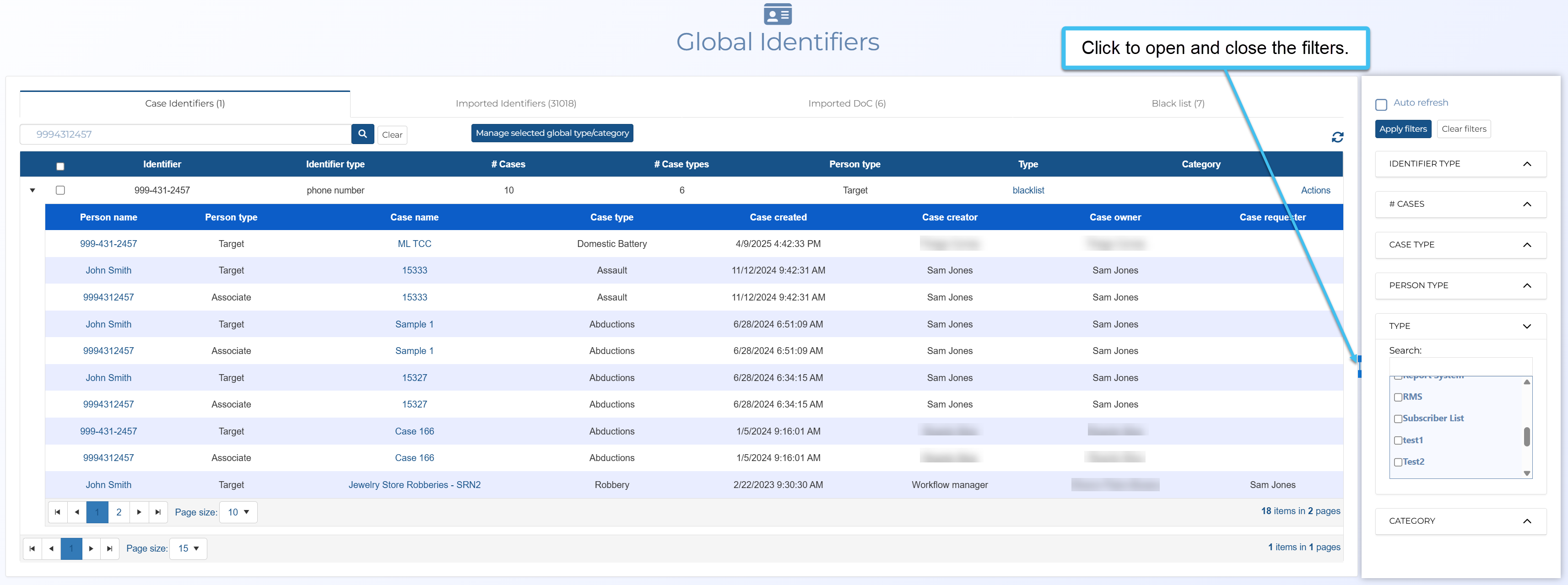 You can open filters to the right of the screen's Case identifiers and Imported identifiers tabs. For example, the Case identifiers tab allows you to apply a combination of filters based on the type of identifier, number of cases, case type, identifier type, and white/black list category.