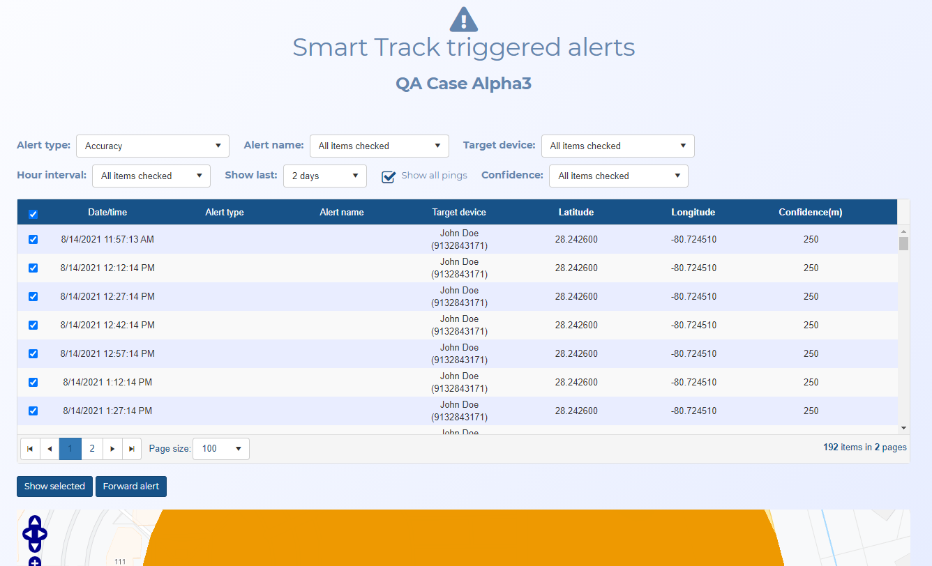 This displays all the available alerts and GPS pings that match the criteria you have selected in the filters.