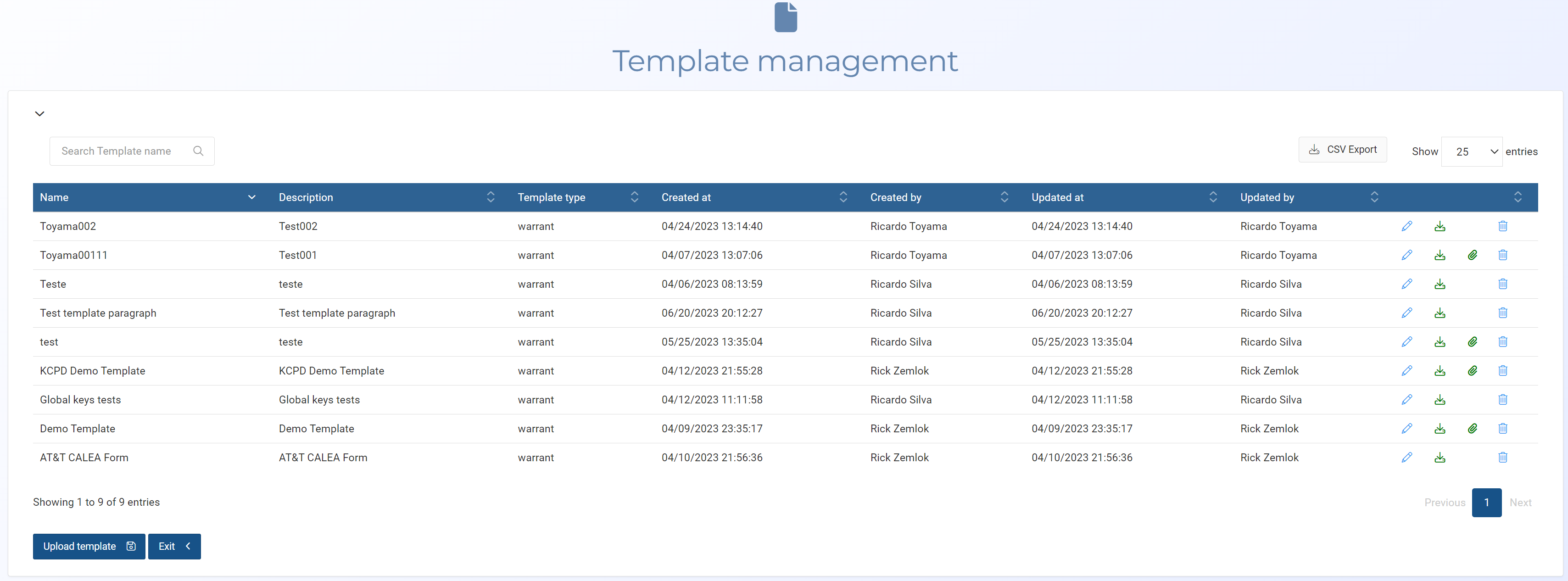 Click to export a csv file of the templates. You can also use the search field to determine which templates are exported, for example, if you only want to export templates that you created then you can first use the search field to filter on your name.