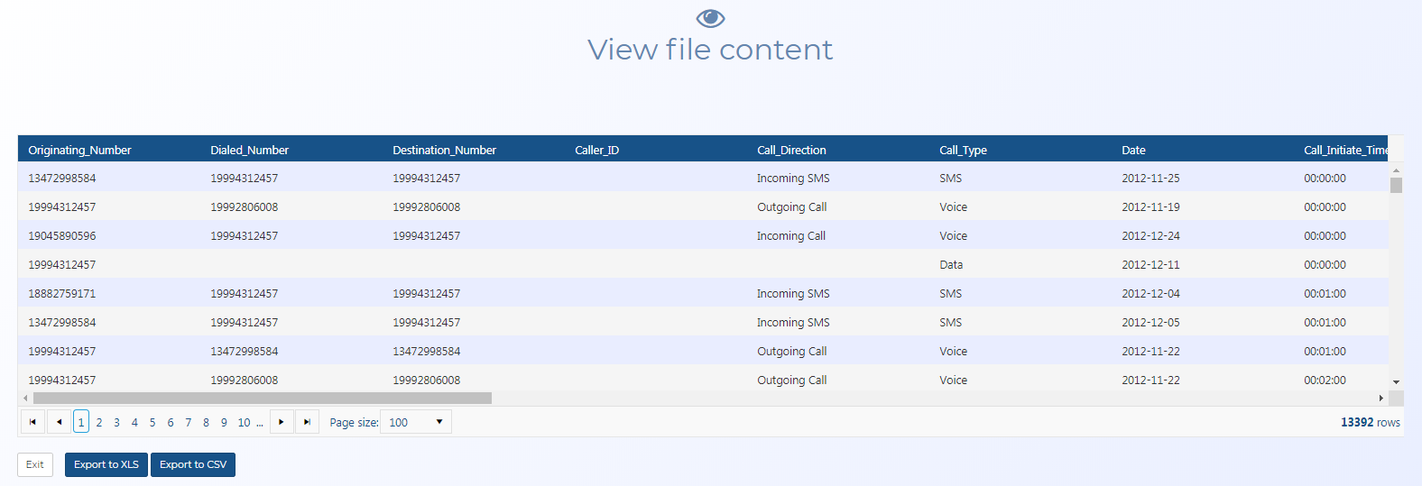 in the Case files section of the Manage case screen. It allows you to view on a separate browser tab the content of the file. It also allows you to export the file in either .xls or .csv formats. This feature primarily allows you to compare the imported data with the original file to ensure the data imported successfully.