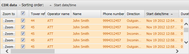 By default the ESPA analysis center map displays all the sectors used by the calls listed, on the Data view's CDR data tab. However to allow you to investigate more easily the locations of specific calls you can select which calls you want the sectors displayed for. The check box immediately beside the Zoom to column allows you to select which calls you want displayed on the map.