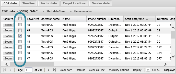 Click Replay to step through the records that are selected on the current page of this tab. The replay feature is available on the CDR data, Timeline, Geo-loc data and HO data tabs. When selected on the: