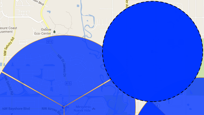 If the issue is due to missing sector orientation the sector is still displayed on the map. However it is displayed on the map as a complete circle since the orientation is not known. It is also displayed with the radius of the circle 70% smaller than the radius used by default for a normal sector as shown in the following graphic.