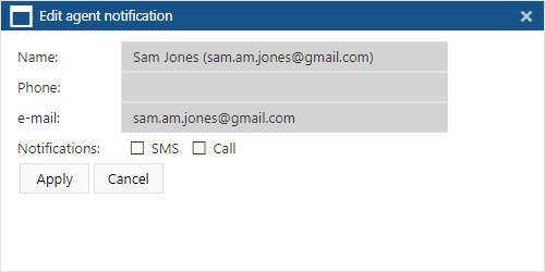 The Edit agent notification dialog box allows you to select the additional methods, other than email, by which the person receives the live location monitoring notifications, that is phone call, and SMS message notifications.