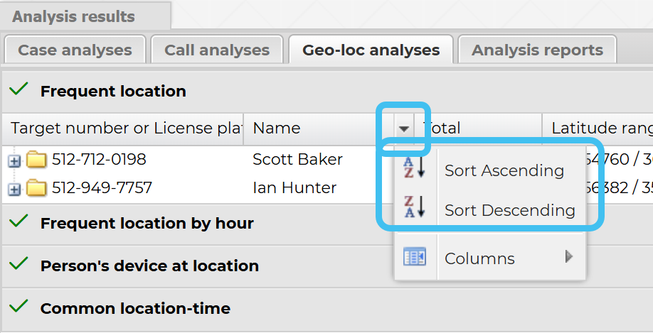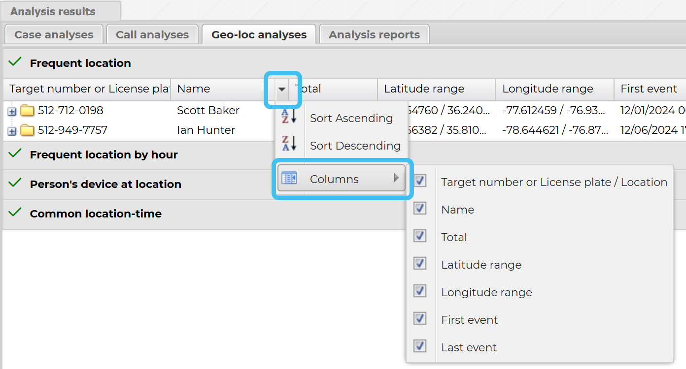 By default the results display all the available columns, for example Frequent location displays all the columns shown in the following graphic but you can select to display only certain columns by selecting the down arrow beside an existing column header, then select Columns.